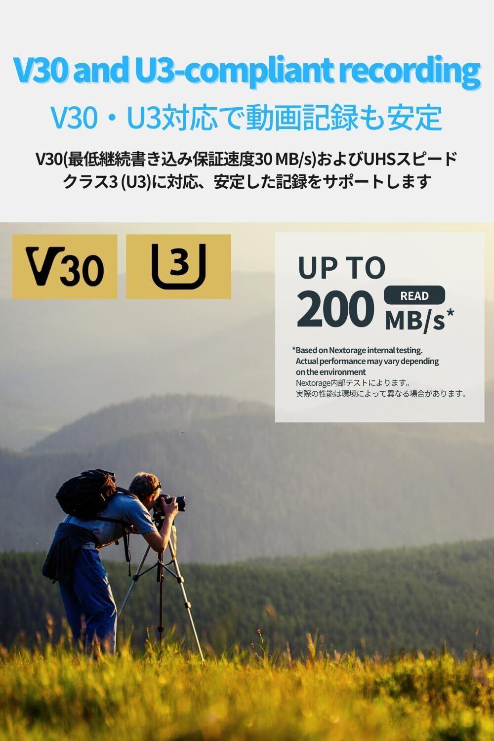 V30、U3規格に対応しており、大容量データも即座に読み込むことが可能です!特に高解像度のビデオや写真を快適に保存できるため、プロのクリエイターやハイアマチュアの方にとって理想的なメモリカードです。さらに、最大読み出し速度200MB/sを実現するためには、Nextorageのデュアルスロットカードリーダー「NX-DF1CL」との併用が推奨されます。