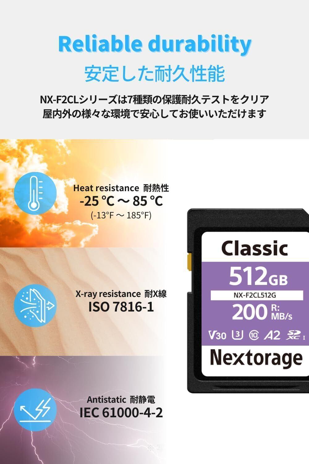 Nextorageのメモリーカードは、防水、防塵、耐温度、耐X線などの厳しい条件にも耐えられる優れた耐久性を持っています!どんな環境でも大切なデータをしっかりと保護しますので、アウトドア活動にも最適です。
