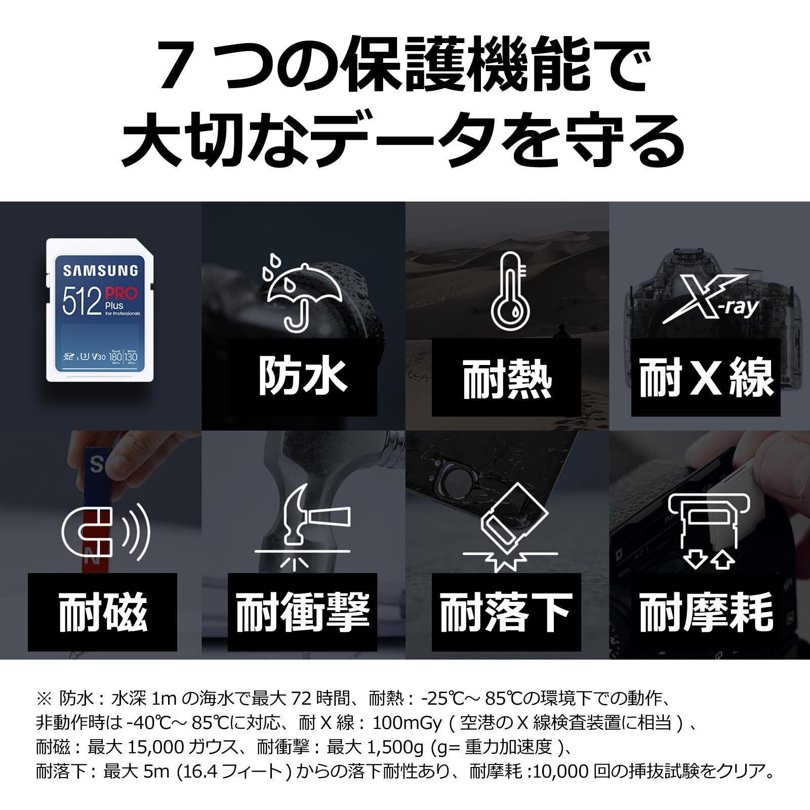 Samsungのメモリーカードは、高温や低温、耐水性など、過酷な環境下でもしっかりとデータを守る設計となっています!日常使用においても安心してご利用いただけるタフな製品です。