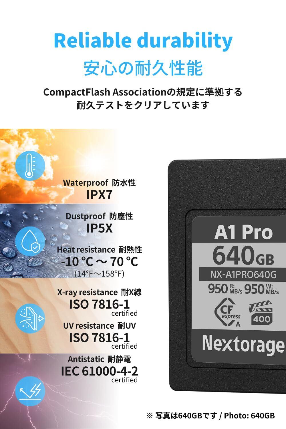 NextorageのCFexpressカードは、耐衝撃性や耐熱性を備えており、厳しい環境下でも安心して使用できます!大切なデータをしっかりと守り、あなたの撮影活動を支える心強いアイテムです。