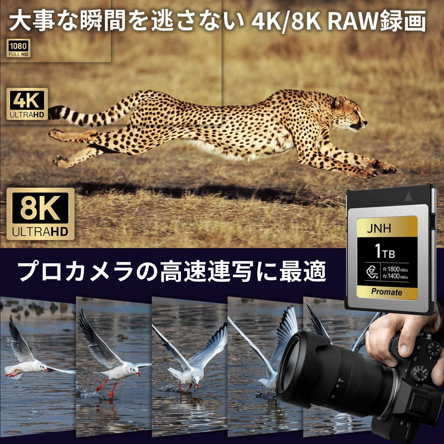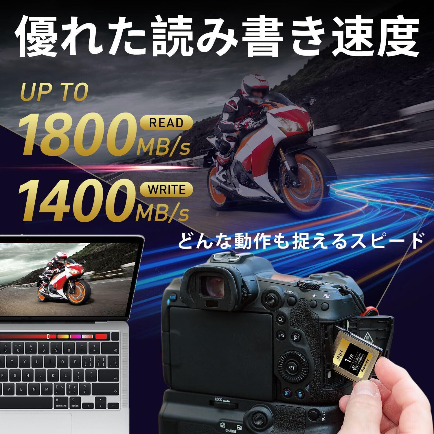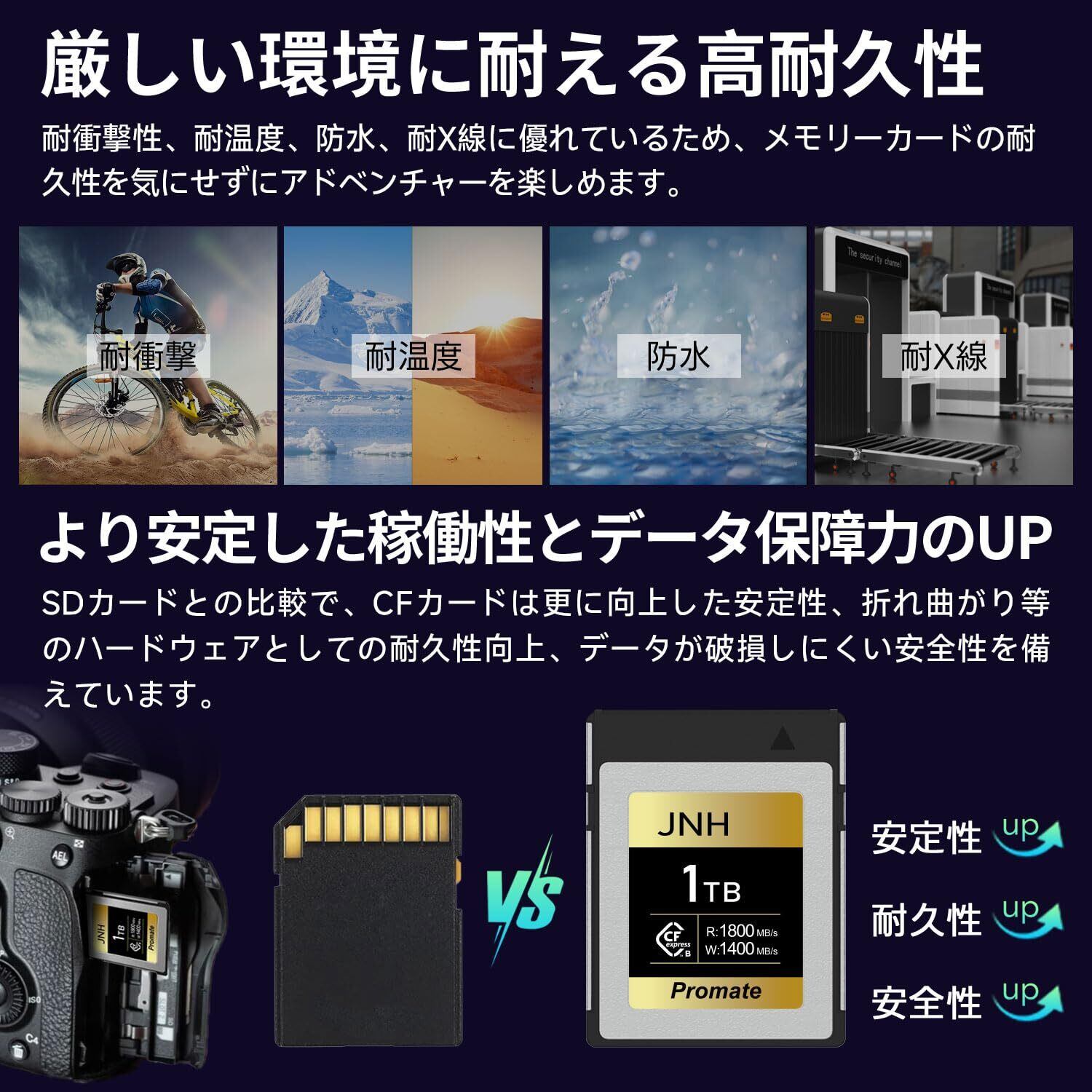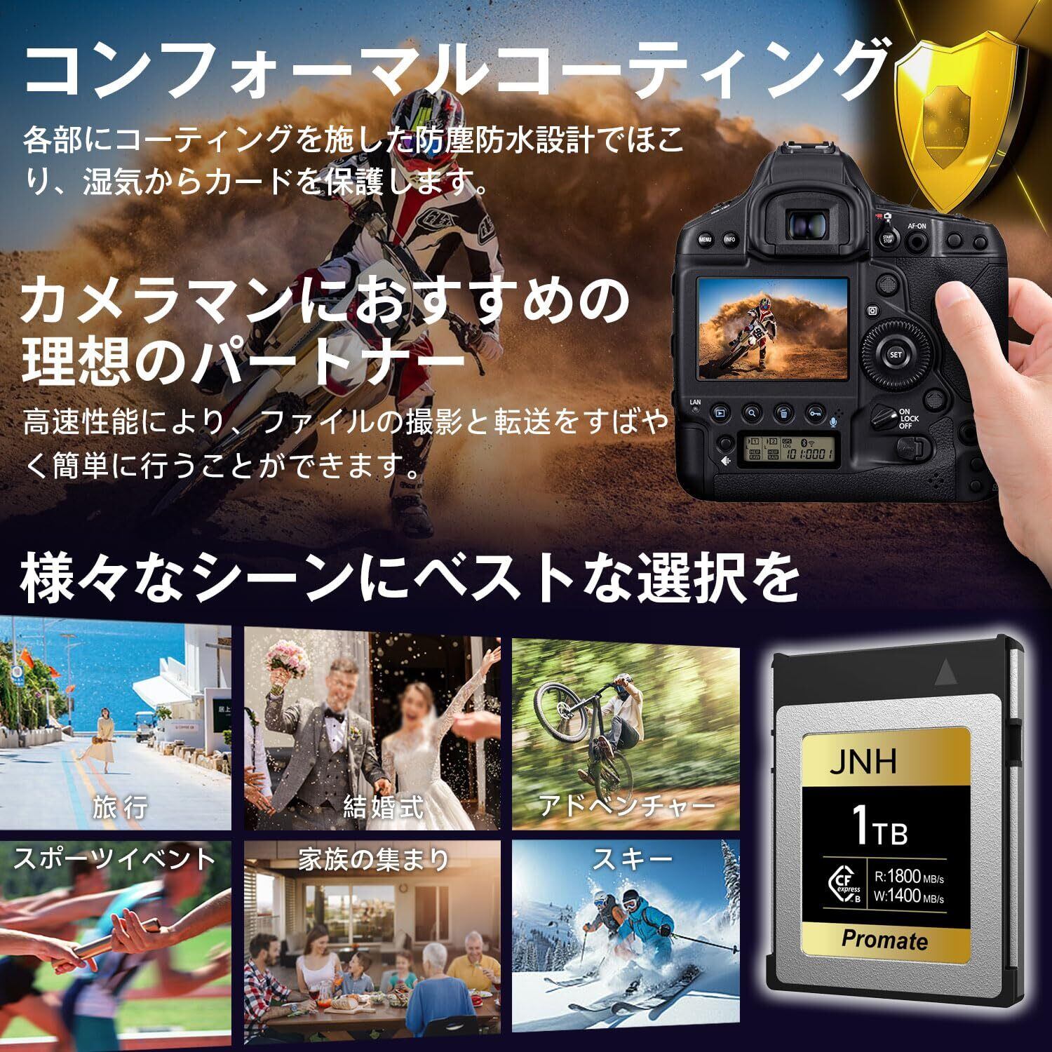 【製品仕様】 製品名:JNH CFexpress Type B メモリーカード;フォームファクタ:CFexpress Type B;容量:1TB;インターフェース:PCIe Gen3x2;NAND フラッシュ:3D TLC;外形寸法:38.5mmx29.6mmx3.8mm;耐久性:耐温度、防水、耐衝撃、耐X線;動作温度範囲:-10℃~70℃;期間:メーカー5年。