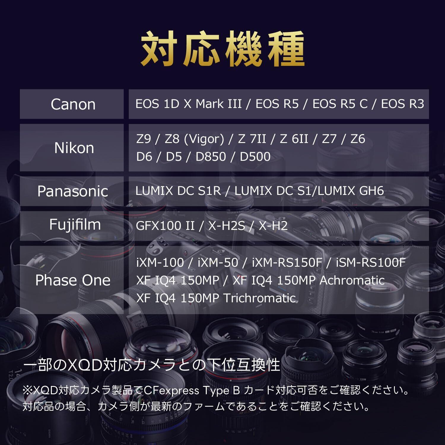 多くのデジタル一眼レフカメラやビデオカメラとの互換性があるため、様々な機種でスムーズなデータ保存が可能です!特にプロフェッショナルな撮影に携わる方々にとって、頼もしい一品となります。
