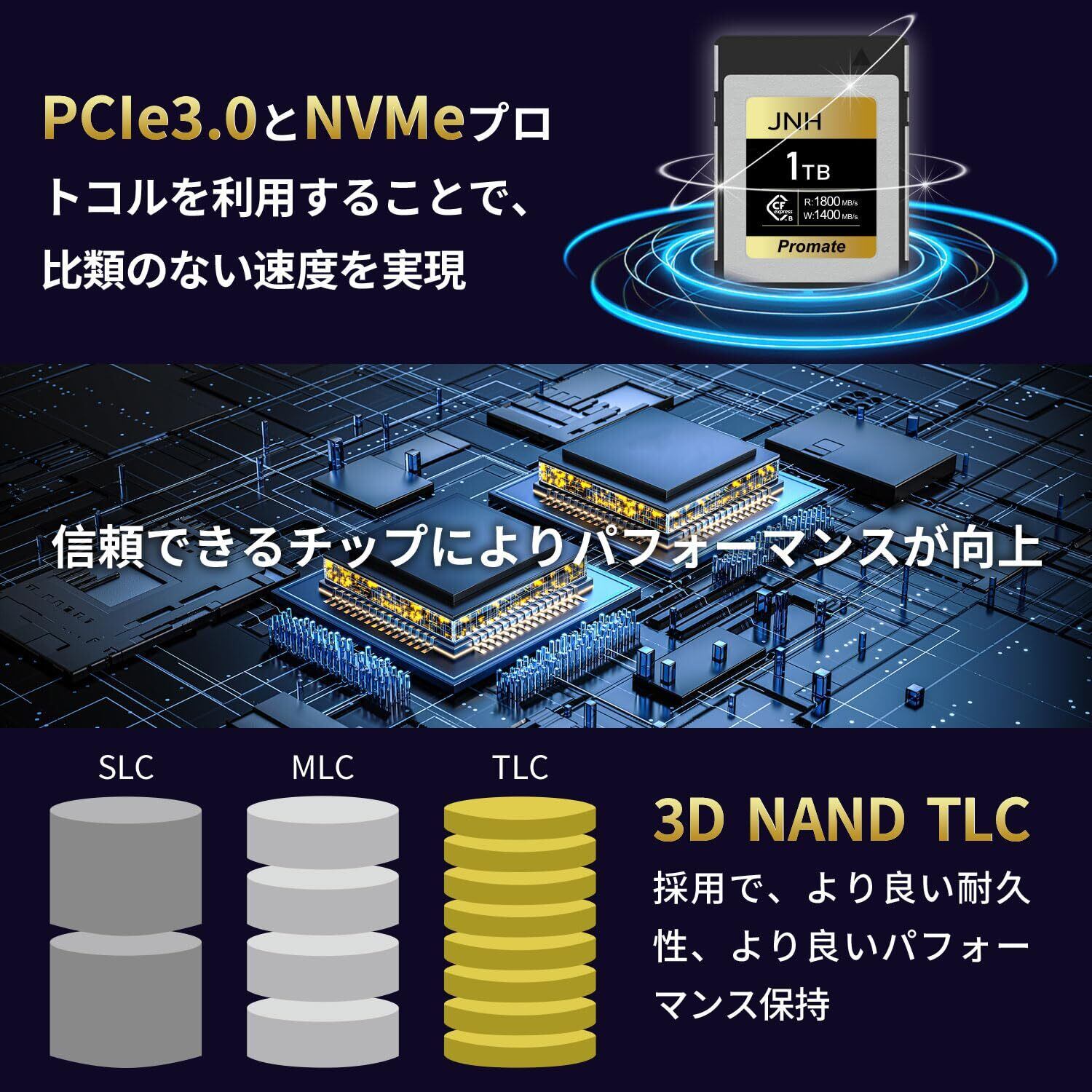 このメモリーカードは、最新のPCIe Gen3.0インターフェースを採用しており、大容量データの瞬時の転送が可能です!動体撮影や高解像度映像の保存にも対応しており、クリエイティブなコンテンツ制作をしっかりとサポートします。