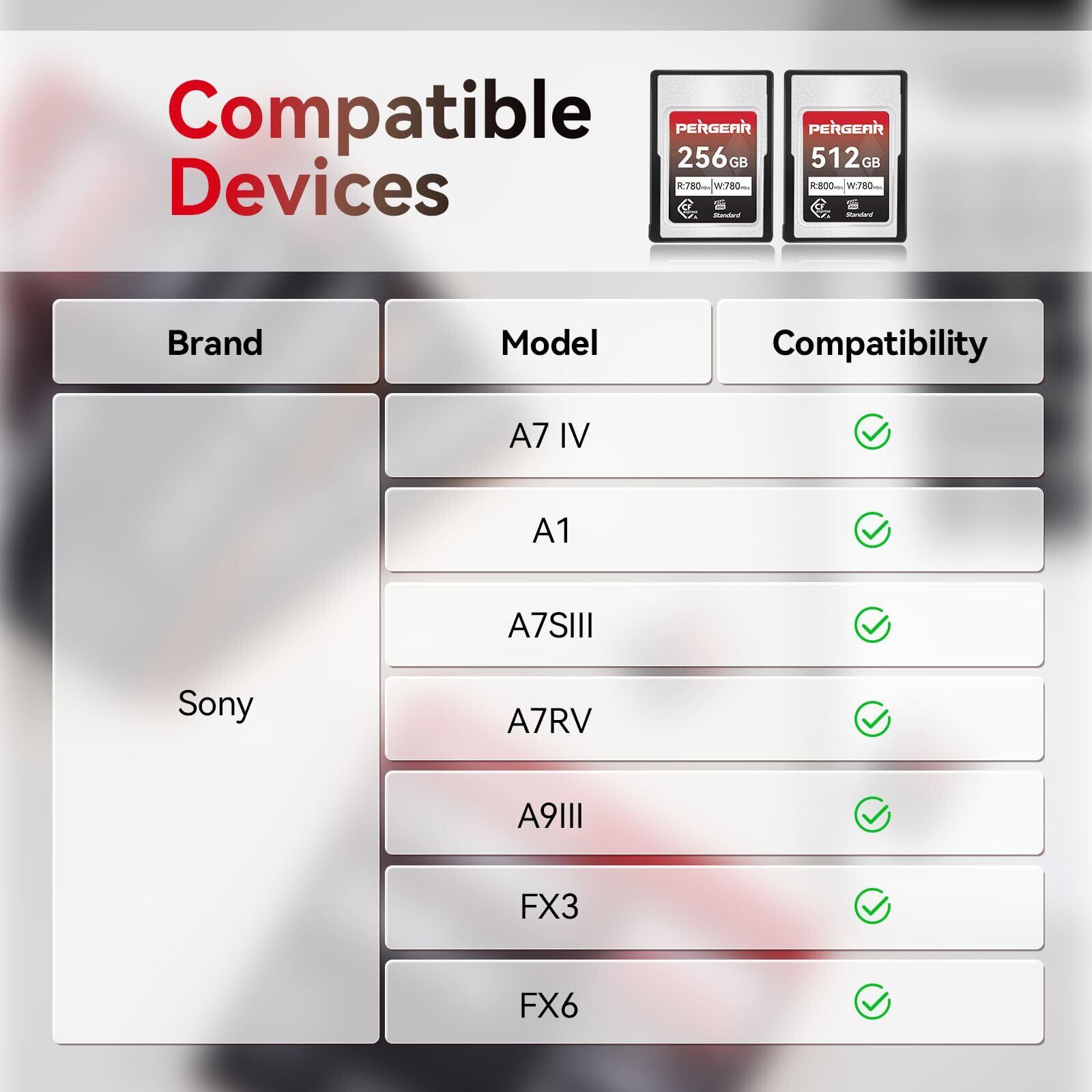 互換性について: Pergear 512GB CFexpress Type Aカードは、Sony Alpha & FX :Sony A7 IV、A1、A7SIII、A7RV、FX3、FX6、A9IIIなどと互換性があります。