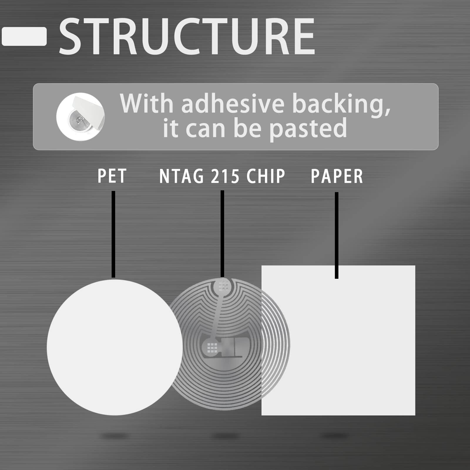 NFCタグ【100枚入り】NTAG215ラベル, 白色 NFCステッカー 防水タグ 書き換え可能 直径25 mm丸型, 504バイトメモリ 13.56MHz NFCチップ, Tagmo、およびすべてのNFC対応の携帯電話とデバイスと互換性があります