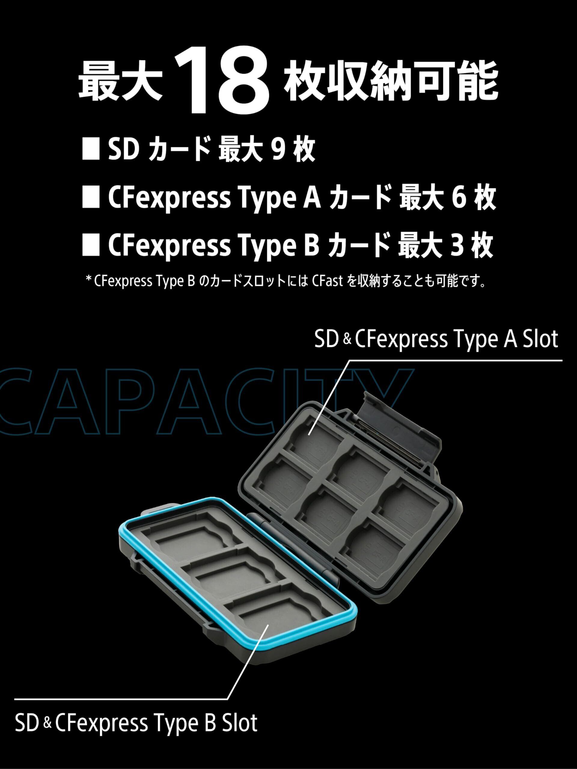 【最大18枚収納可能】最大でSDカード9枚+CFexpress Type Aメモリーカード6枚、またはSDカード9枚+CFexpress Type Bメモリーカード3枚を収納することができます。 ※CFexpress Type BメモリーカードスロットにはCFastメモリーカード3枚を収納することも可能です。※メモリーカードは付属しておりません。