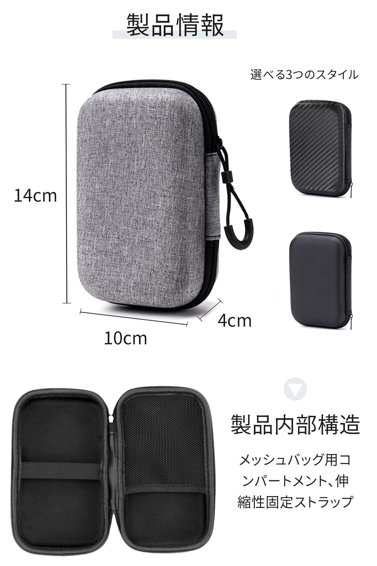 【3色展開&コンパクトサイズ】ブラック/カーボンファイバー/グレーの3カラーから選択可能。サイズは14×10×4cmの小型設計で、バッグの隅々までスッキリ収納。オフィスでも旅行先でも場所を選ばずご利用いただけます。