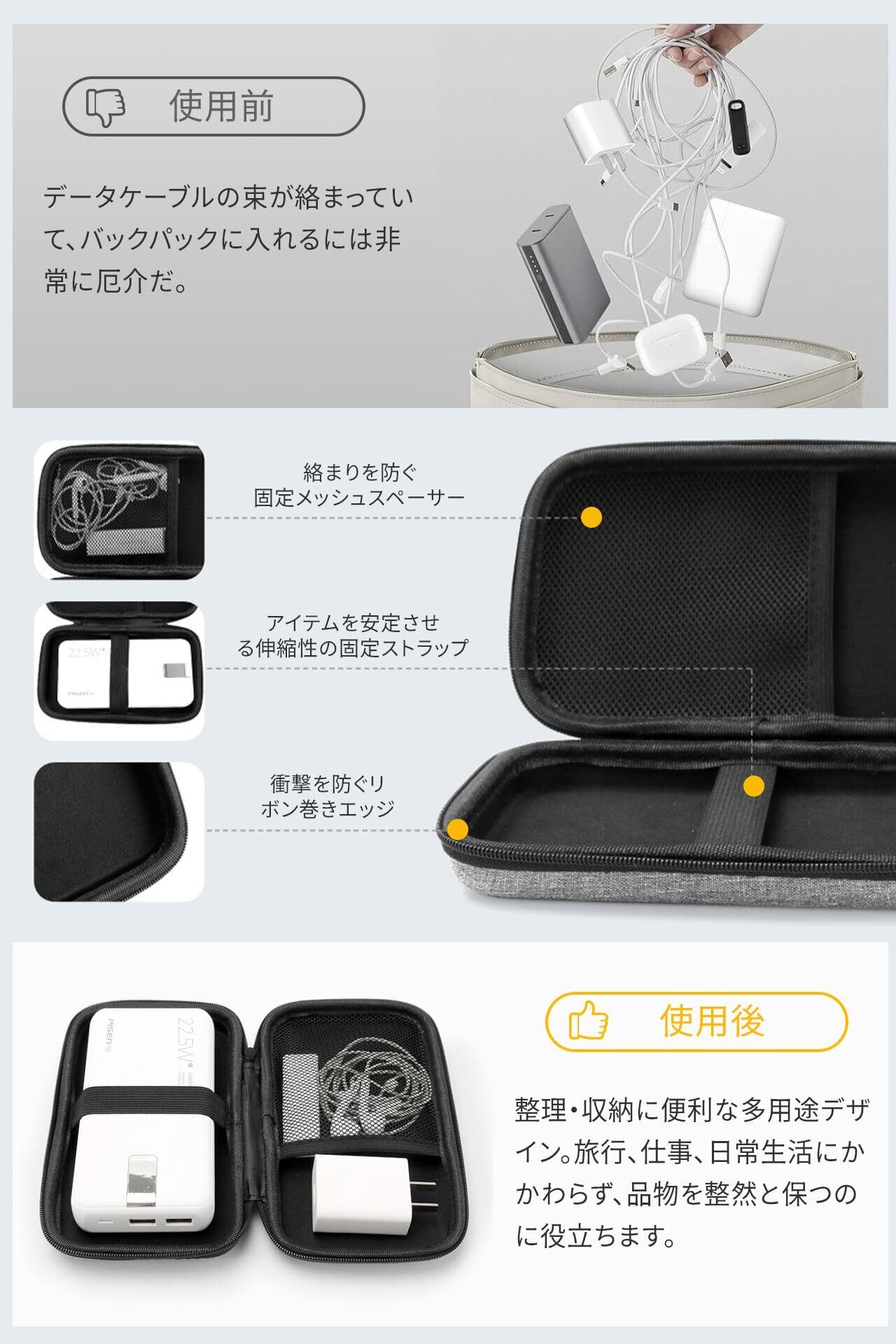 このケースは、モバイルバッテリー、充電器、イヤホンなどの小物をきれいに整理整頓できます!内側の仕切りにより、異なるアイテムをしっかりと分けて収納できるため、持ち運び時にも安心です。