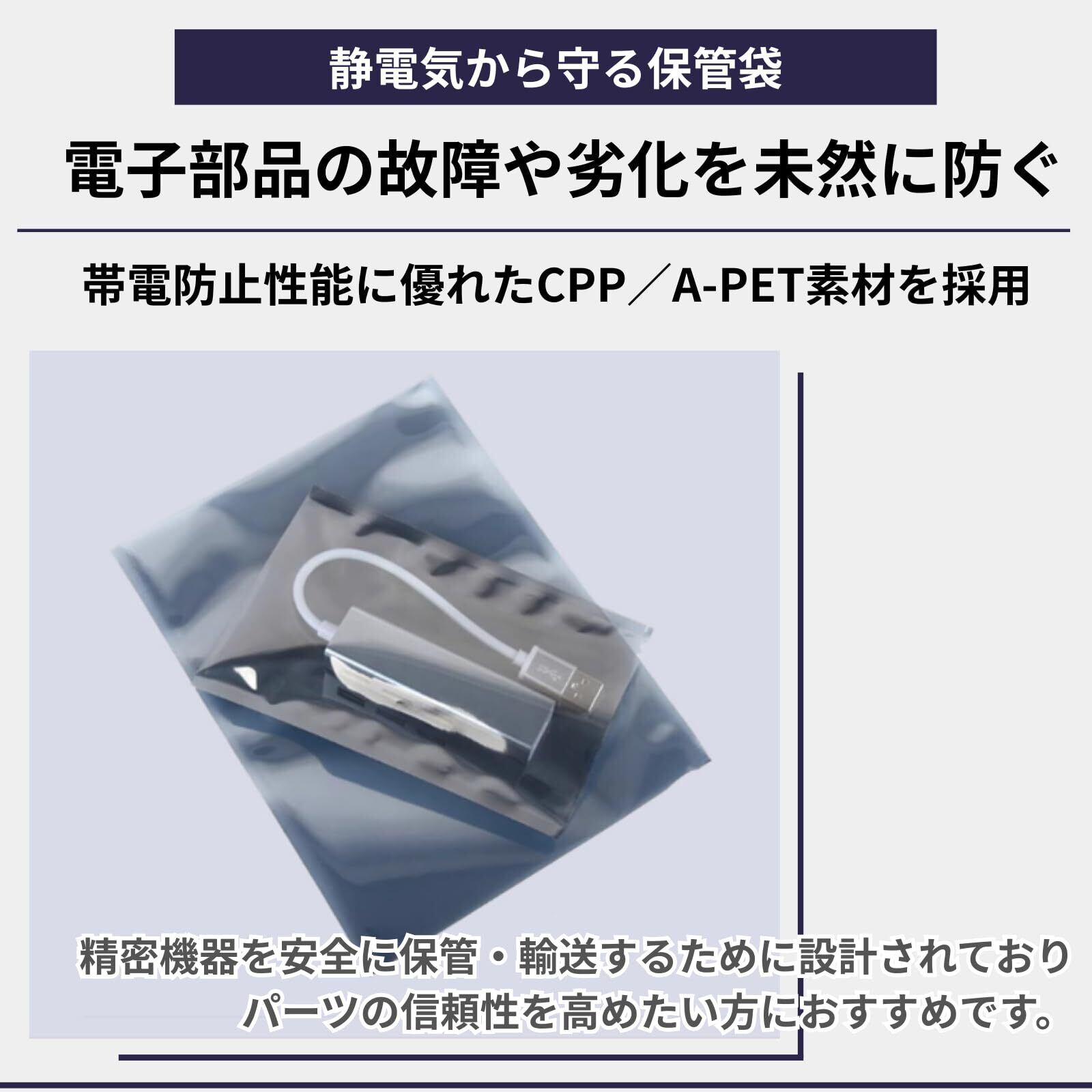 【静電気から守る保管袋】 帯電防止性能に優れたCPP/A-PET素材を採用し、静電気による電子部品の故障や劣化を未然に防ぐ静電気防止袋です。ICチップ、SSD、基板、メモリなどの精密機器を安全に保管・輸送するために設計されており、パーツの信頼性を高めたい方におすすめです。
