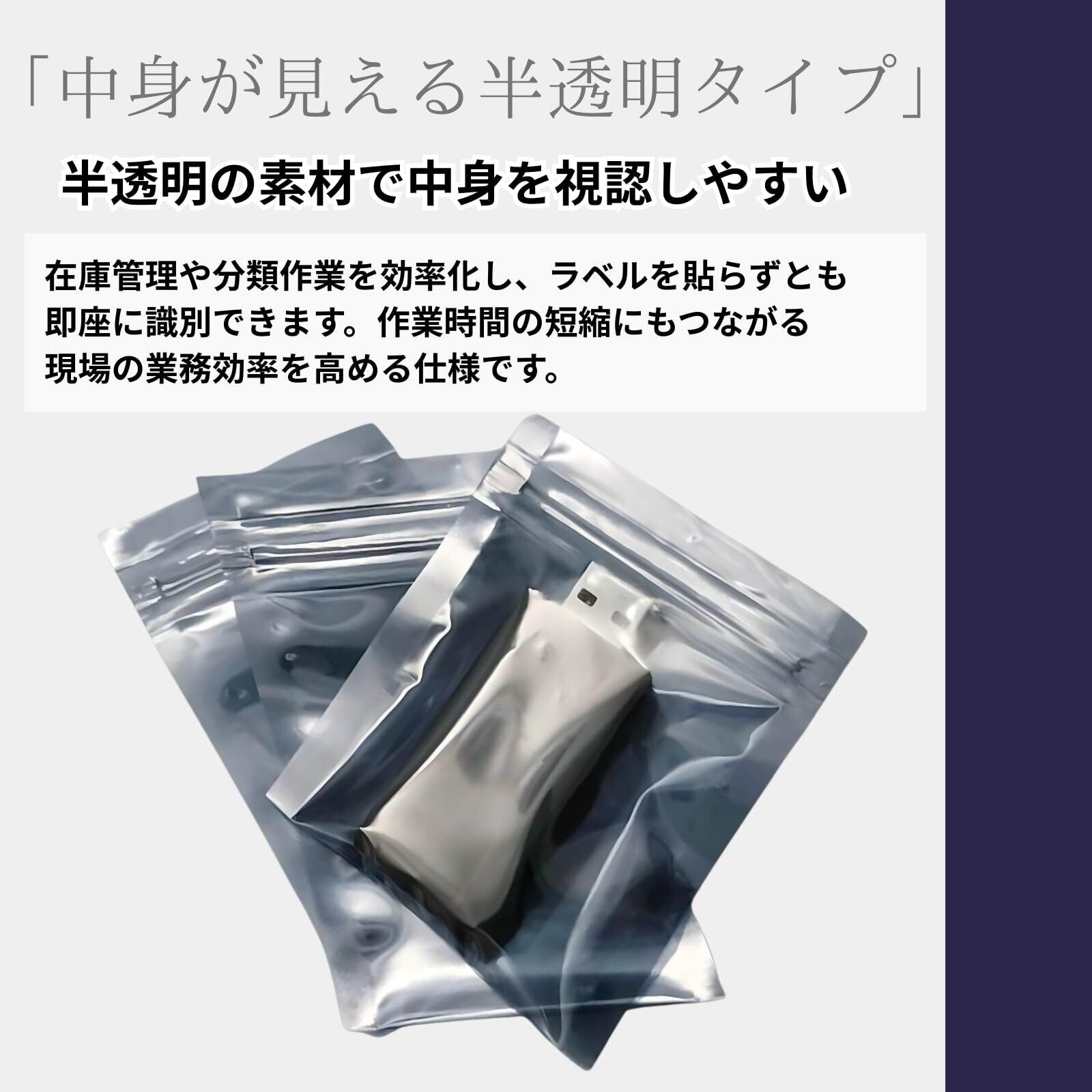 【中身が見える半透明タイプ】 半透明の素材で中身を視認しやすく、袋を開けずに内容物を確認可能。在庫管理や分類作業を効率化し、ラベルを貼らずとも即座に識別できます。作業時間の短縮にもつながる、現場の業務効率を高める仕様です。