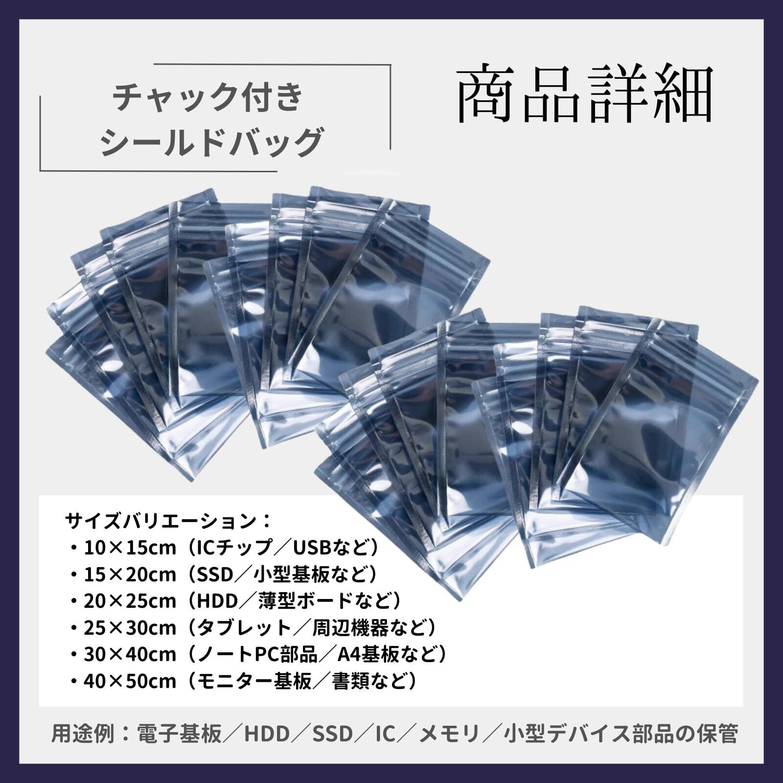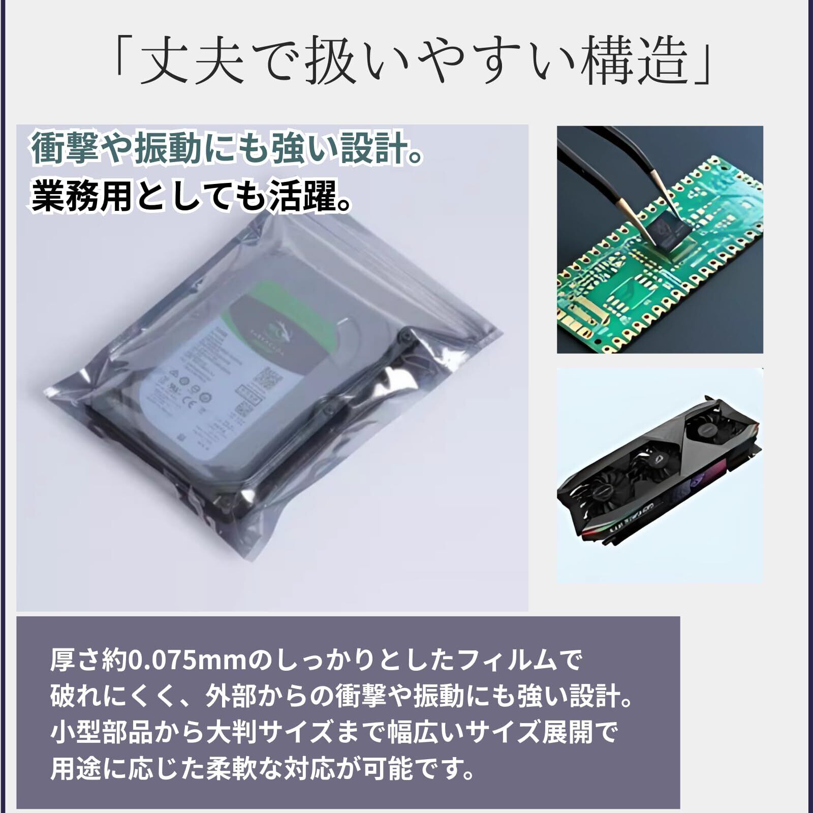 【商品詳細】 サイズバリエーション: ・10×15cm(ICチップ/USBなど) ・15×20cm(SSD/小型基板など) ・20×25cm(HDD/薄型ボードなど) ・25×30cm(タブレット/周辺機器など) ・30×40cm(ノートPC部品/A4基板など) 厚さ:約0.075mm 素材:CPP/A-PET(導電性フィルム) 仕様:チャック付き/半透明/再利用可 用途例:電子基板/HDD/SSD/IC/メモリ/小型デバイス部品の保管・分類・輸送用