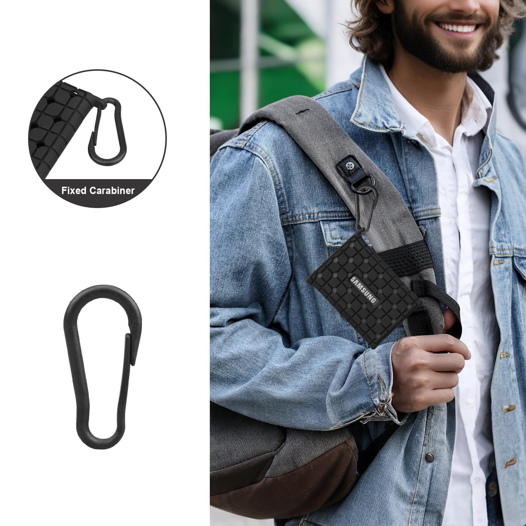内側には、T7 SSD専用のフィット感を考慮したデザインが施されており、安心して収納できます。さらに、カラビナが付属しているため、バックパックやベルトに簡単に取り付け可能。持ち運びがさらに便利になります!