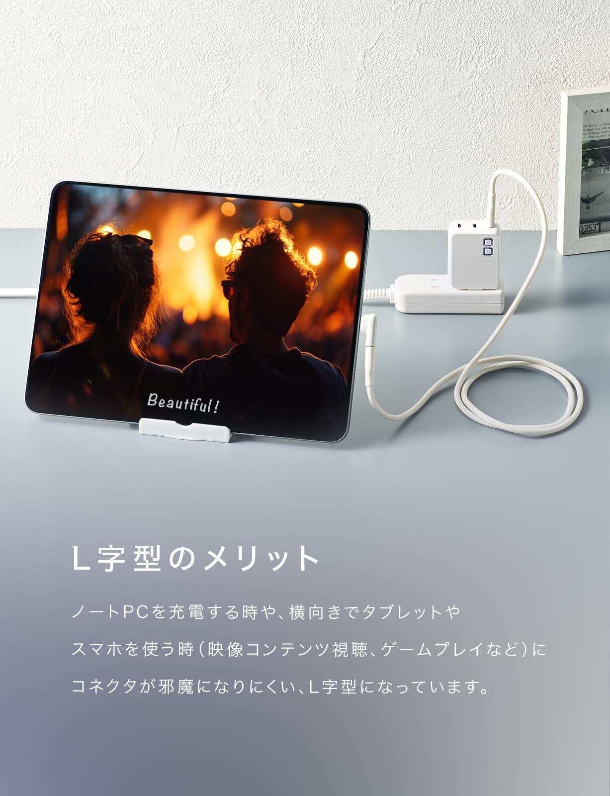 L字型のデザインにより、狭いスペースでも使いやすく、ケーブルがしまいやすいのが特徴です。日常の使用や外出時にも、邪魔にならないデザインが魅力です。このアダプタがあれば、必要な時にサッと使用できます。