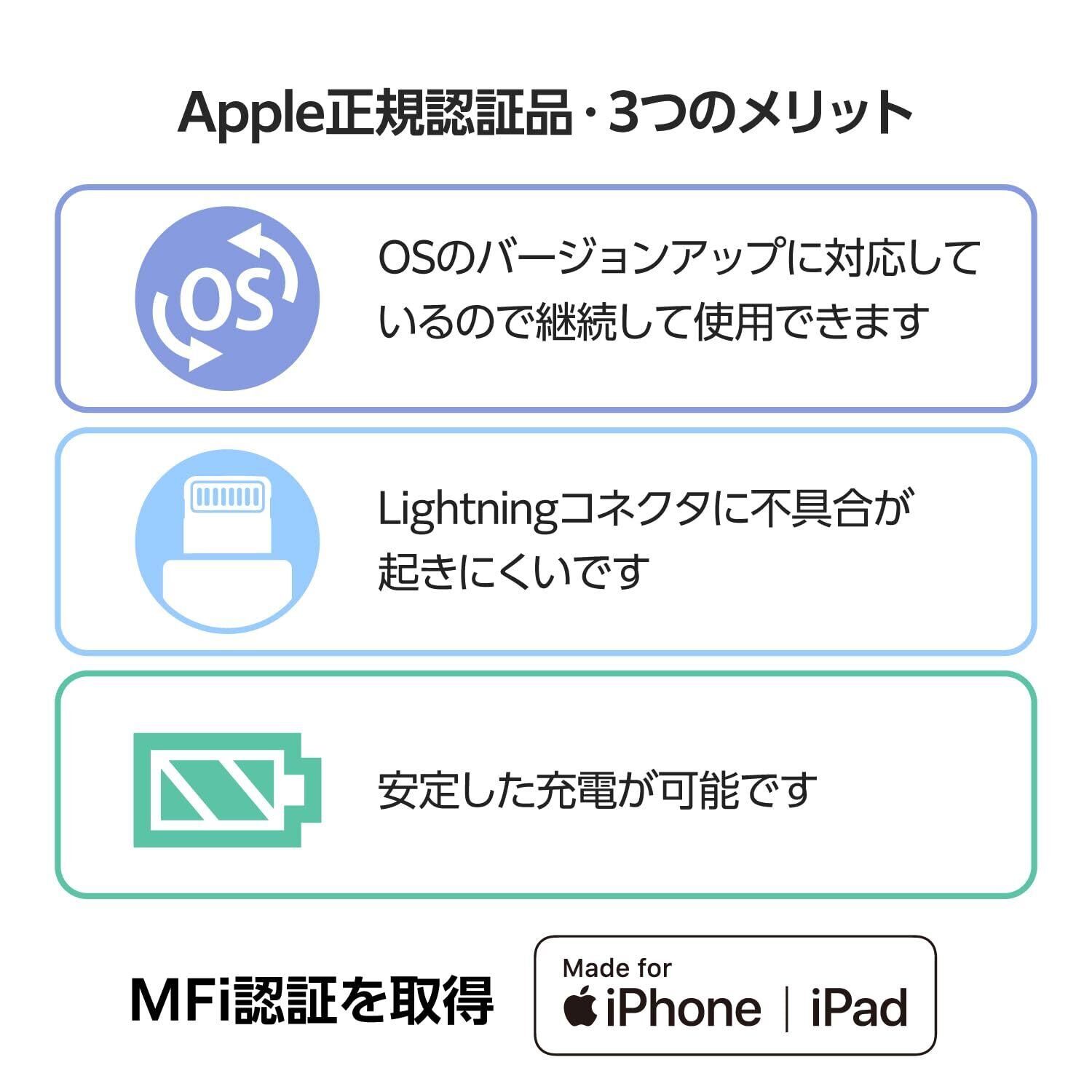 ■AppleのMFi(Made for iPhone/iPad)正規認証を取得した製品です。iOS・iPadOSのアップデートに対応しているので心配なく使えます。