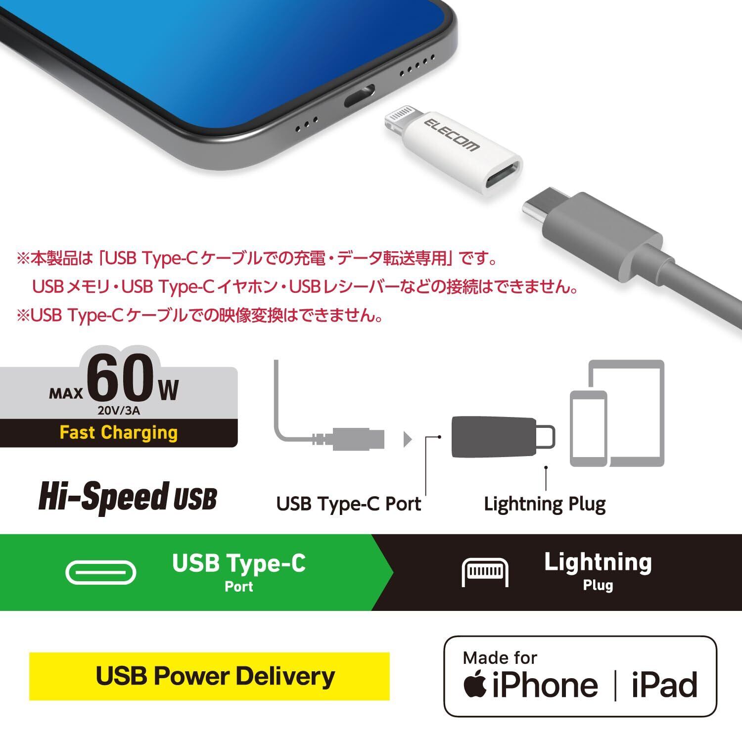 「エレコム USB Type-C to Lightning 変換アダプタ」は、あなたのAppleデバイスの充電を便利にするための必須アイテムです!60WのUSB PD(Power Delivery)に対応し、高速充電を実現します。