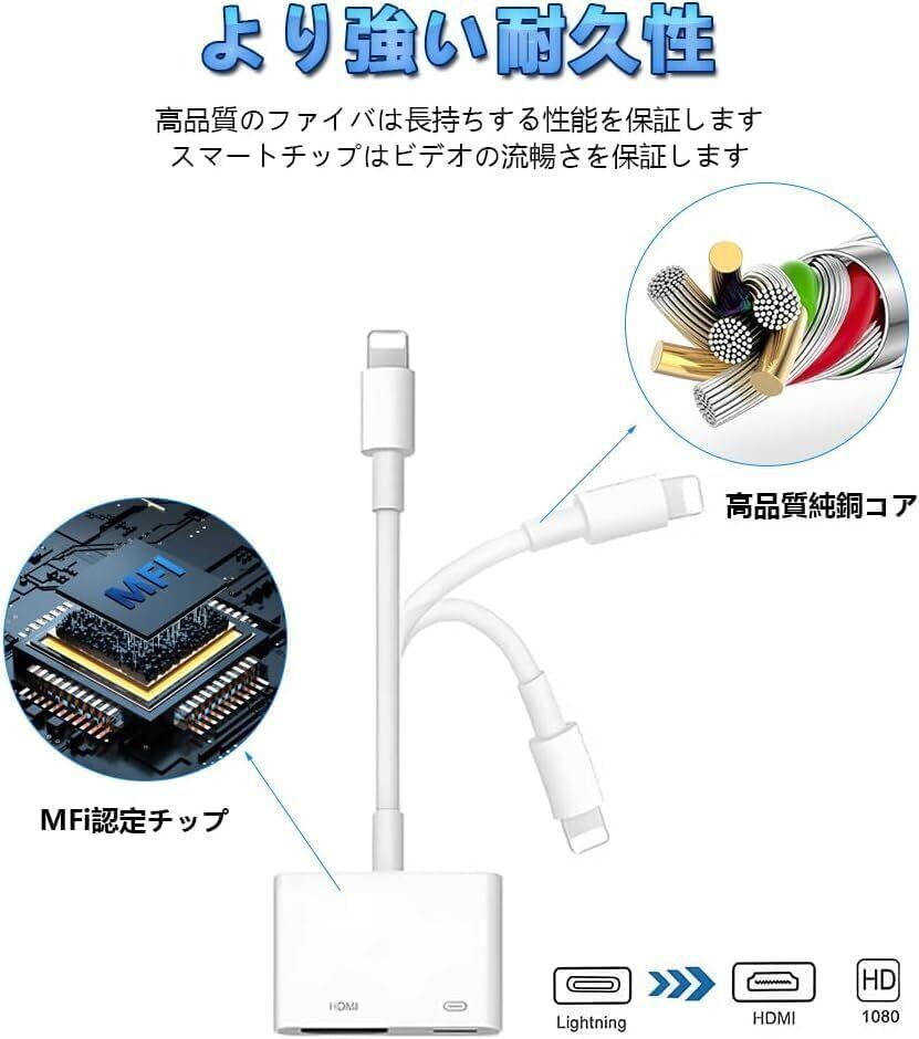 【正規認証品・MFi認証】:このiphone hdmi 変換ケーブルは、最新の変換テクノロジーに適合した高品質の銅線ケーブルがあり、画質の歪み、ゴースト、尾引きなどの不安定な要素を避け、1080pの高精細な画像を実現できます.ビデオと音声を同期して転送することで、映画館のような映像をお楽しみいただけます.伝送速度は通常のiphone hdmi変換ケーブルの10倍以上となっています.