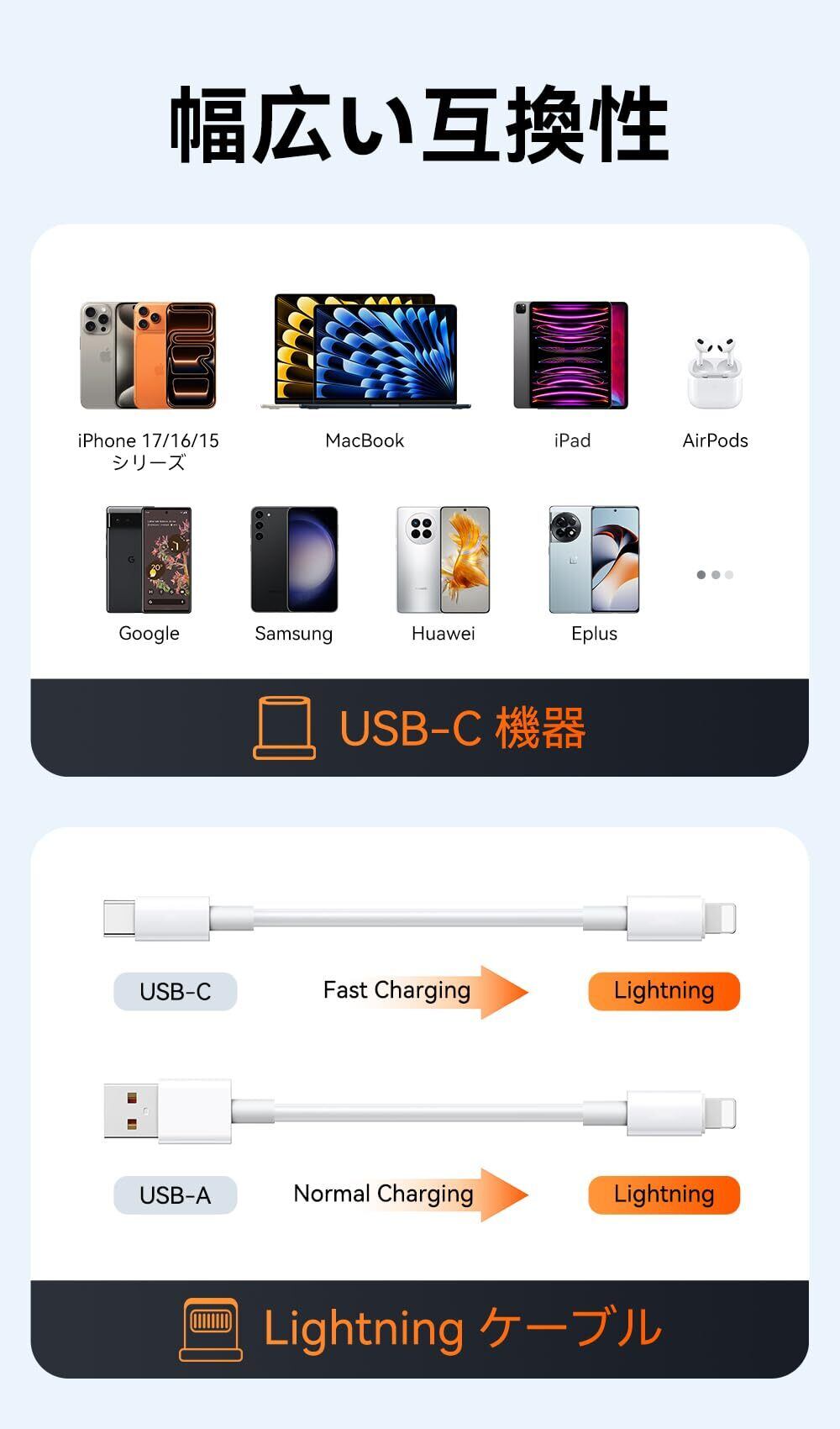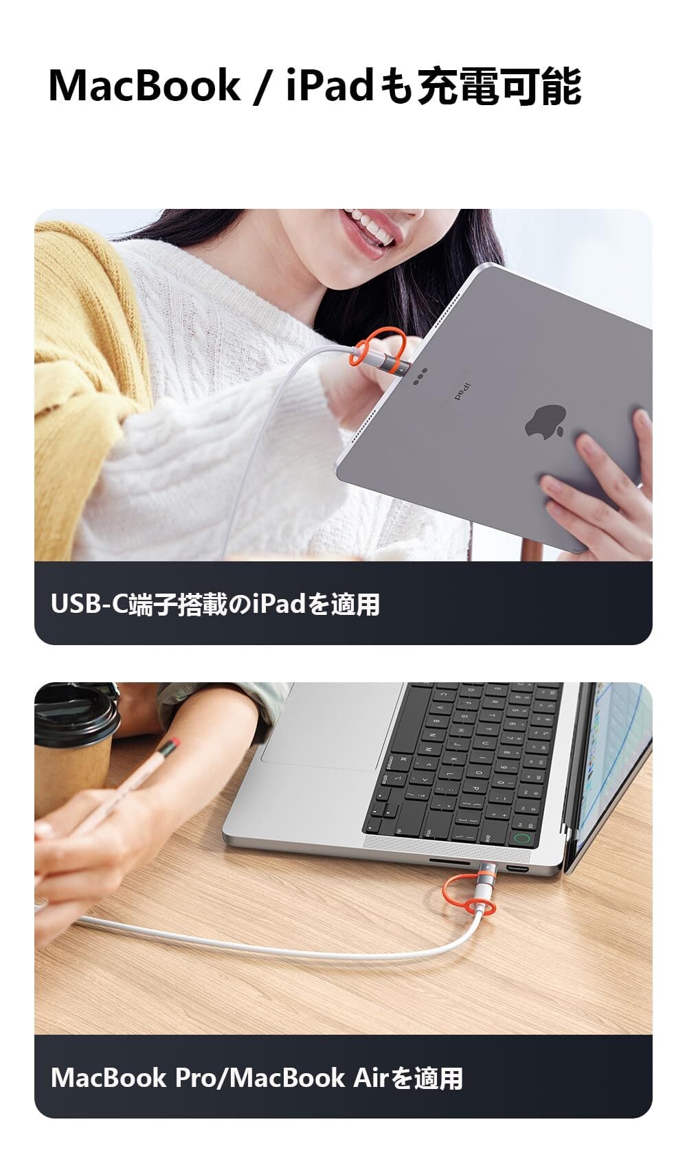 【60W PD急速充電】:USB PD (Power Delivery)による最大60Wの急速充電・高速データ転送を対応できます。USB-C to ライトニングケーブルを接続して、30分でiPhone 15を60%ぐらい充電済。(※PD急速充電対応のケーブル(USB-C to light-ningケーブル)を組み合わせて使用することをお勧めします。※USB-A to light-ningケーブルを接続して、普通充電を対応します)。※本製品は、アップルペンシル、多機能ケーブル間の変換を対応しません。予めにご了解していただけます。