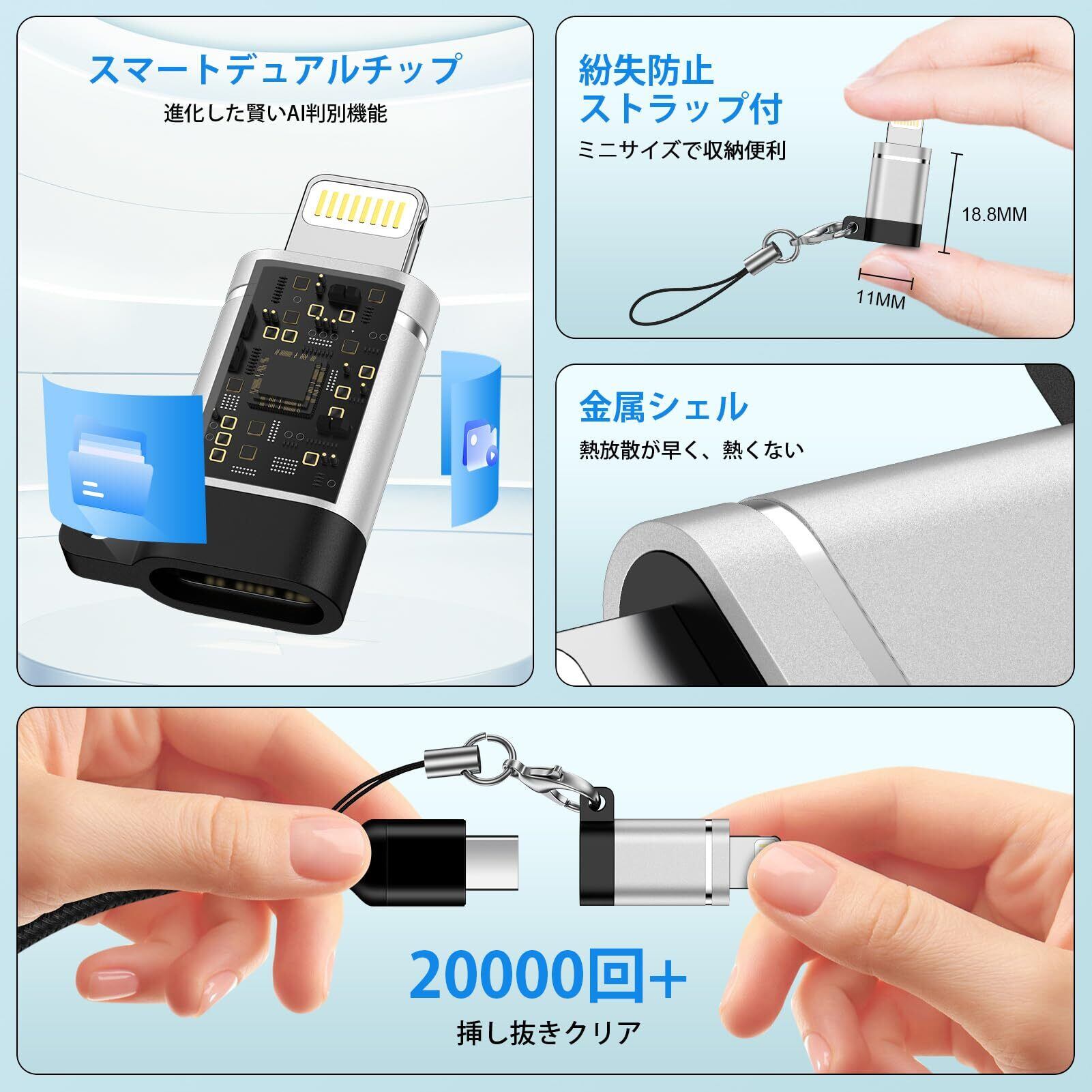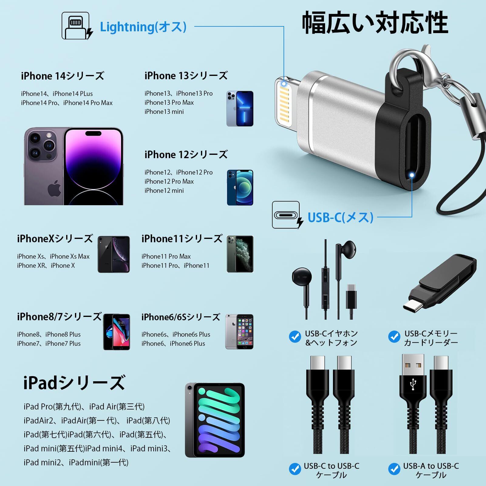 【急速充電&高速データ転送】このUSB C-LightningアダプタはE-markerスマートチップを内蔵し、電流と電圧を自動調節でき、常に安全で安定した3A高速充電を実現し、フル充電時間を短縮。写真や動画も480MbpsのUSB2.0速度で瞬時転送。【OTG機能対応】USB C-LightningアダプタはOTG映像・音声プロトコルをサポート:Type-Cイヤホン使用可能、内蔵マイク操作/音楽再生・停止・音量調節機能。接続可能デバイス:USB-Cイヤホン/USB-Cフラッシュメモリ/USB-Cカードリーダー/マウス/キーボード/マイク等。