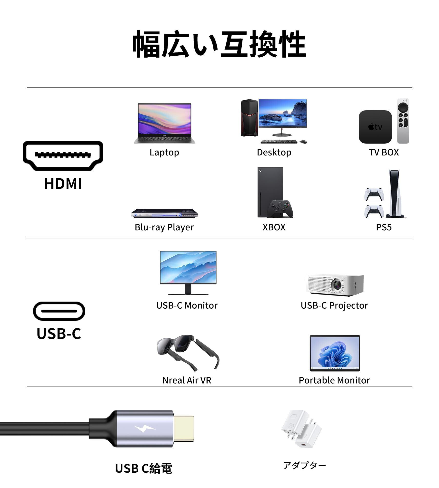 「HDMI to Type-C 変換ケーブル」は、最新のテクノロジーを活用した映像体験を求める方に最適なアイテムです!USB-C端子を持つデバイスをHDMI対応のテレビやモニター、さらにはARグラスに接続することができ、驚きの映像クオリティを実現します。