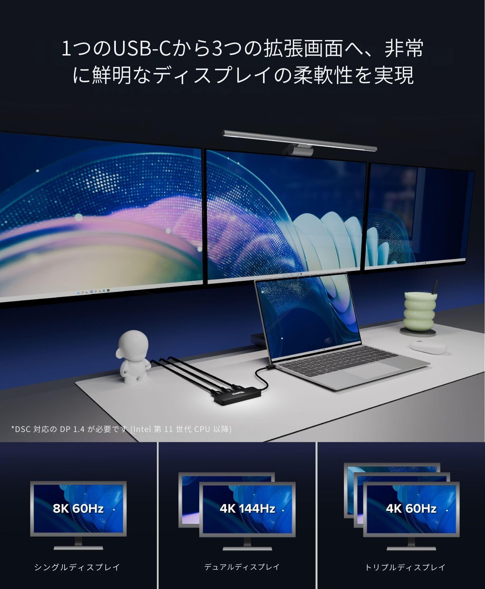 対応: 最大解像度を実現するには、DP 1.4かつDSC対応のホスト(Intel第11世代以降のCPU)が必要です。Windows 10以降、またはChromeOS 100以上のシステムで、映像出力対応のUSB Type-C、USB4、Thunderboltポートを備えたデバイスで動作します。Macシステムには推奨されません。