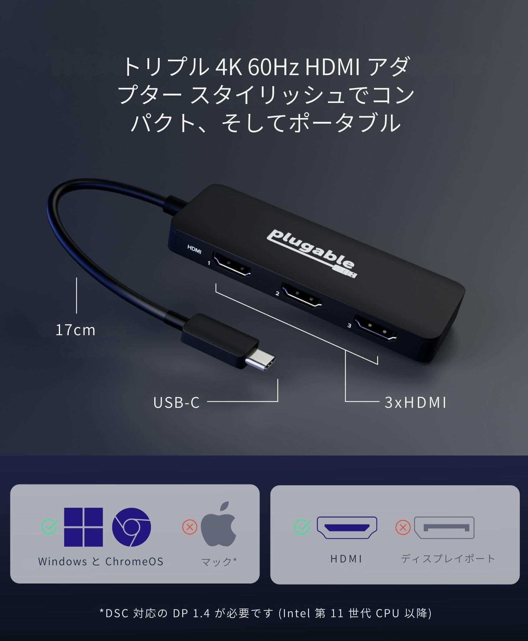 Plugable USB-C to HDMI マルチモニターアダプター、トリプル 4K60 ディスプレイ対応、ドライバ不要 MST ハブ (Windows/Chrome OS対応)、USB-C、Thunderbolt、USB4、ノートPC用、複数HDMIポート搭載、HDR・HDCP対応 (USBC-MSTH3)!