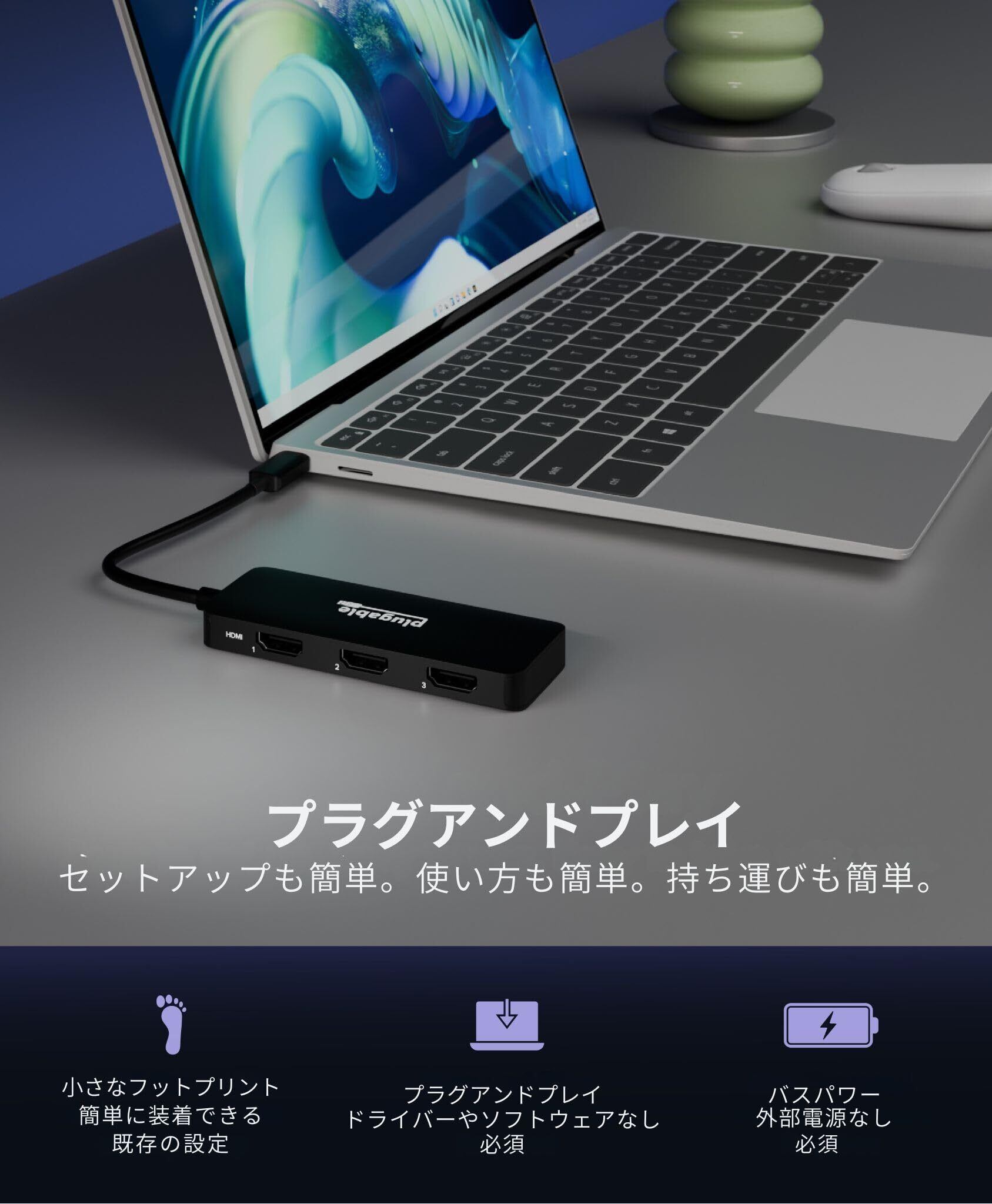 主な特長: USB Type-Cポート1つで最大3台の4Kディスプレイに接続可能。このUSB-C to HDMIアダプターはプラグアンドプレイ対応で、HDRおよびHDCPをサポート。コンパクトなデザインで、オフィスでも外出先でも快適に使用可能。