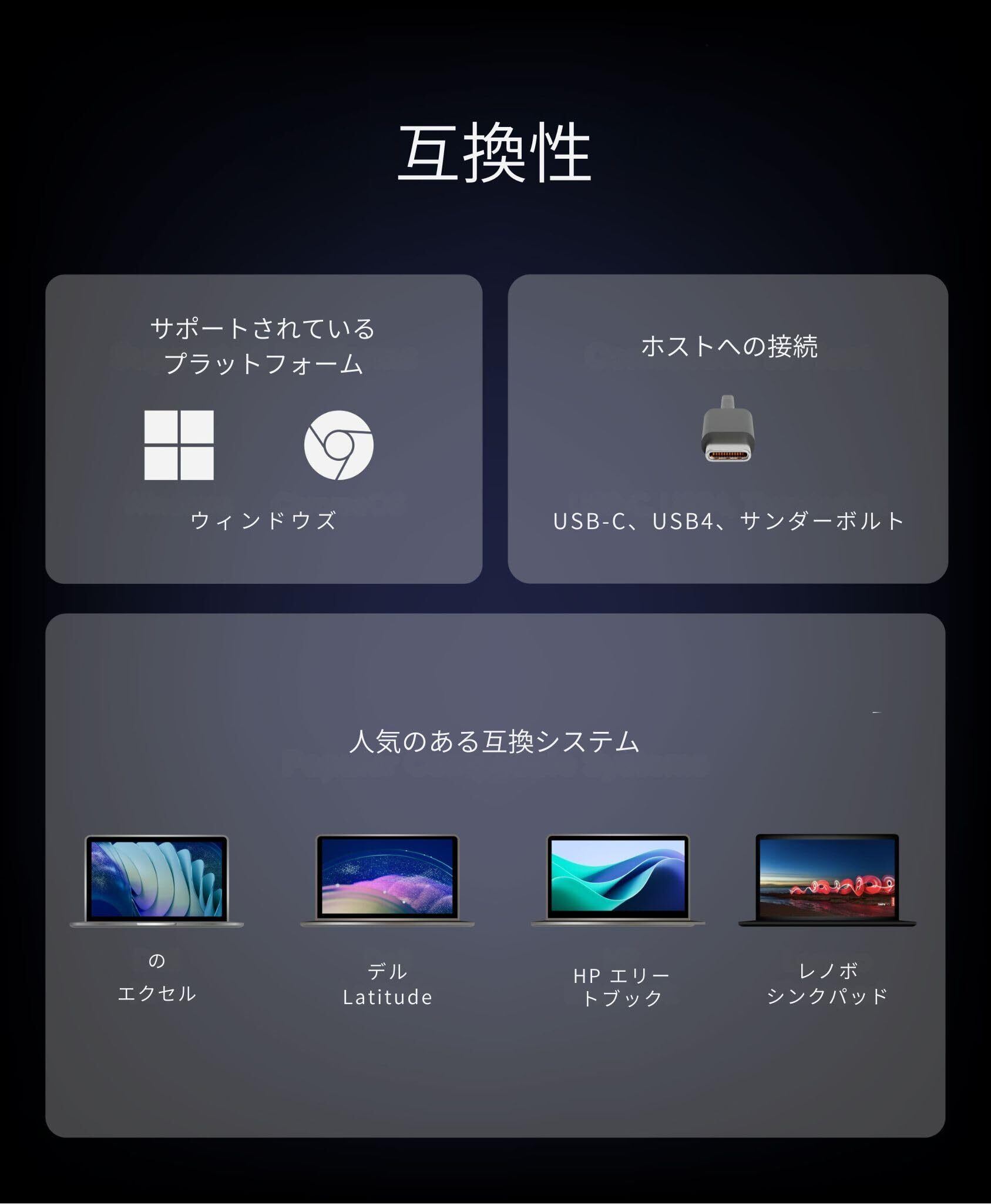 USB-C、Thunderbolt、USB4に対応しており、幅広いデバイスと互換性があります。WindowsやChrome OSのデバイスでも問題なく使用できるため、さまざまな環境で活躍します!