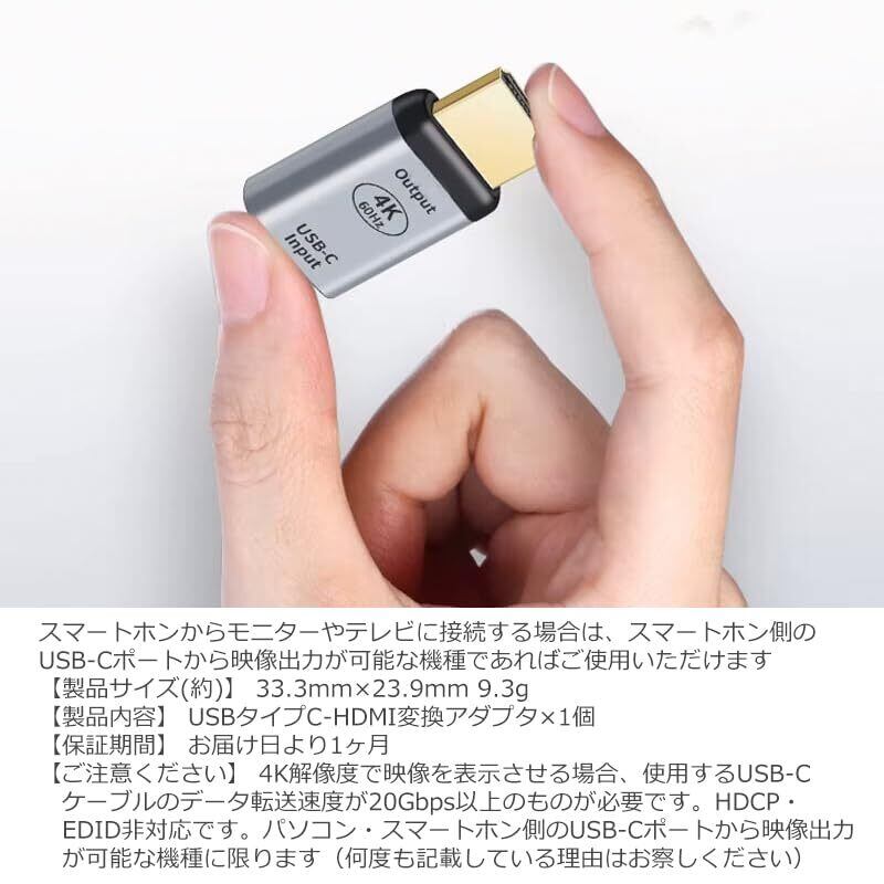 【製品サイズ(約)】 33.3mm×23.9mm 9.3g 【製品内容】 USBタイプC-HDMI変換アダプタ×1個 【期間】 お届け日より1ヶ月 【ご注意ください】 4K解像度で映像を表示させる場合、使用するUSB-Cケーブルのデータ転送速度が20Gbps以上のものが必要です。HDCP・EDID非対応です。パソコン・スマートホン側のUSB-Cポートから映像出力が可能な機種に限ります※USBタイプCのケーブルは映像出力対応のケーブルをご用意ください(何度も記載している理由はお察しください)
