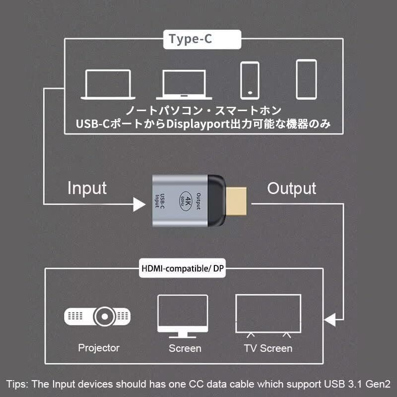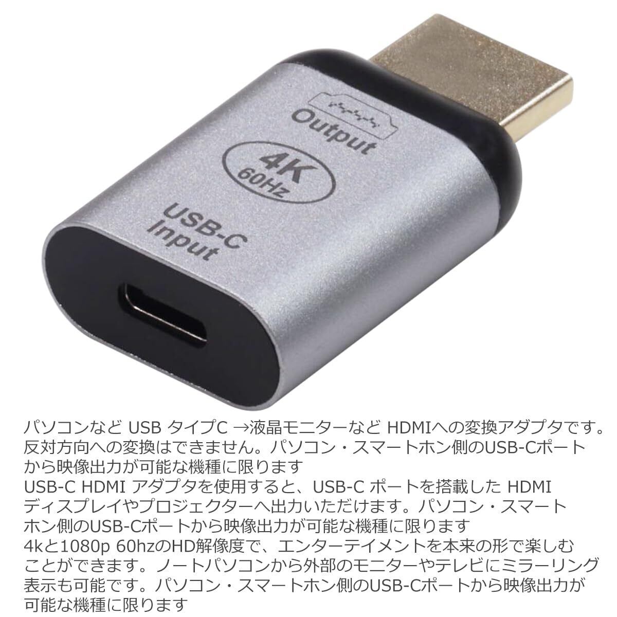 DisplayPort Alternate Mode (DP Alt Mode) 対応のパソコンなど USB タイプC → 液晶モニターなど HDMI への 変換アダプタです。反対方向への変換はできません。パソコン・スマートホン側のUSB-Cポートから映像出力【DP Alt Mode対応】が可能な機種に限ります※USBタイプCのケーブルは映像出力対応のケーブルをご用意ください