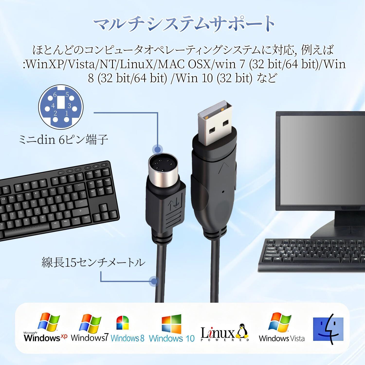 USB-PS/2変換コンバータ 高速安定変換 USB2.0 変換ケーブル PS/2キーボード マウス 用 USBオス to ミニDIN 6pin メス 変換アダプタ ケーブル!