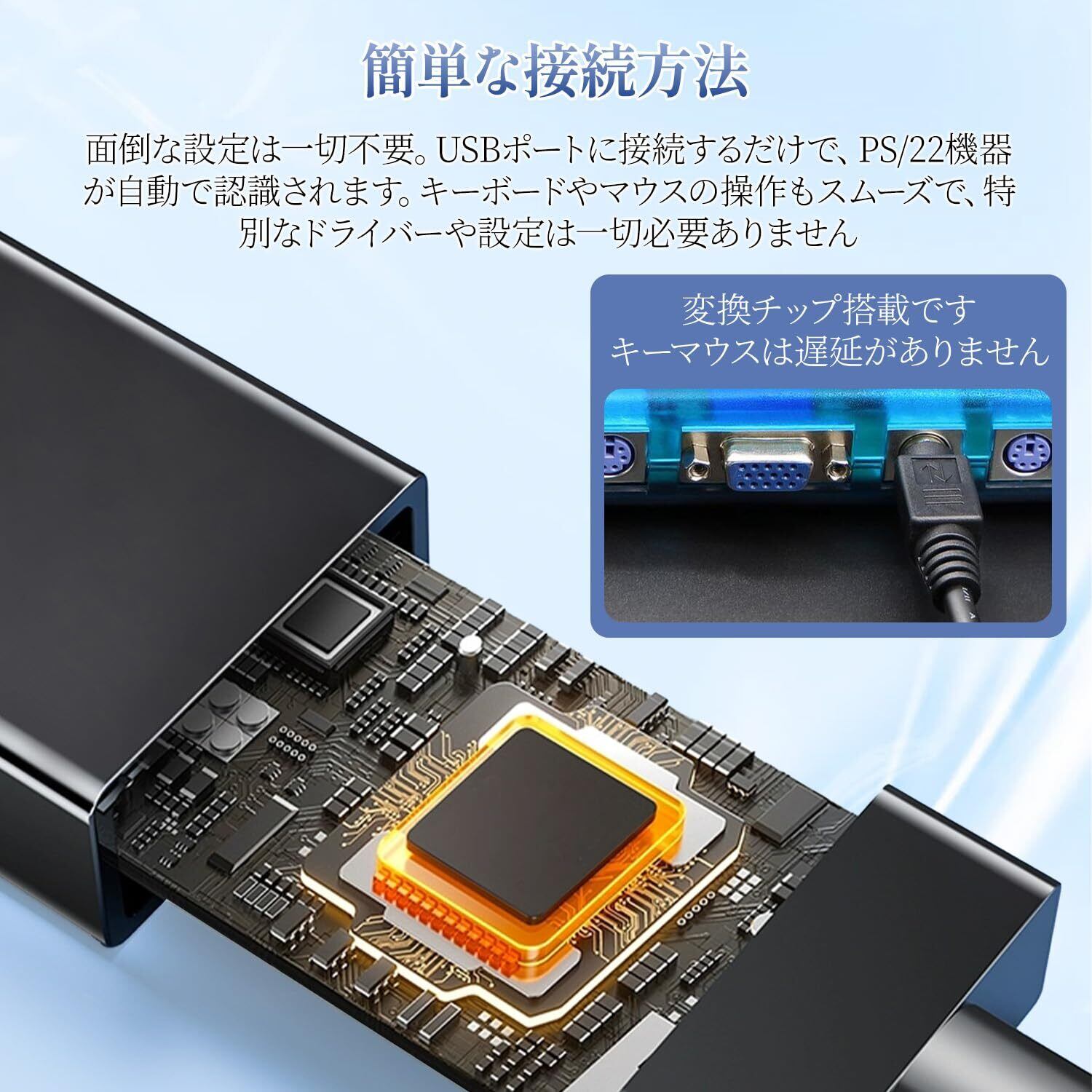 「USB-PS/2変換コンバータ」は、PS/2接続のキーボードやマウスをUSBポートに接続するために設計された便利な変換ケーブルです!この製品を利用することで、古い周辺機器を現代のコンピュータに簡単に接続し、快適な作業環境を実現します。
