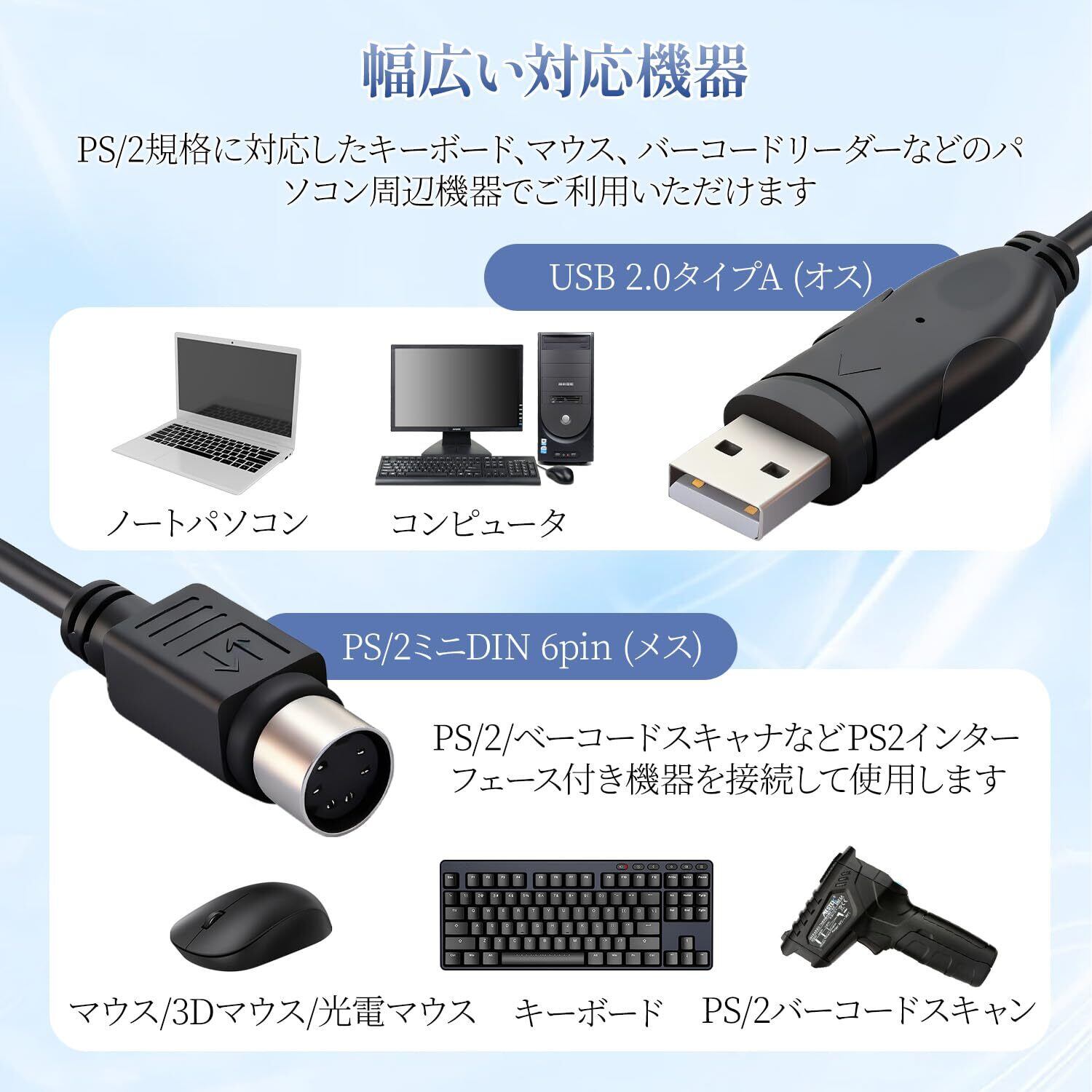 USB-PS/2変換コンバータ USB2.0 変換ケーブル USB A (オス) -ミニDIN 6pin (メス) 変換 PS/2接続 キーボード・マウス用 アダプターケーブル!