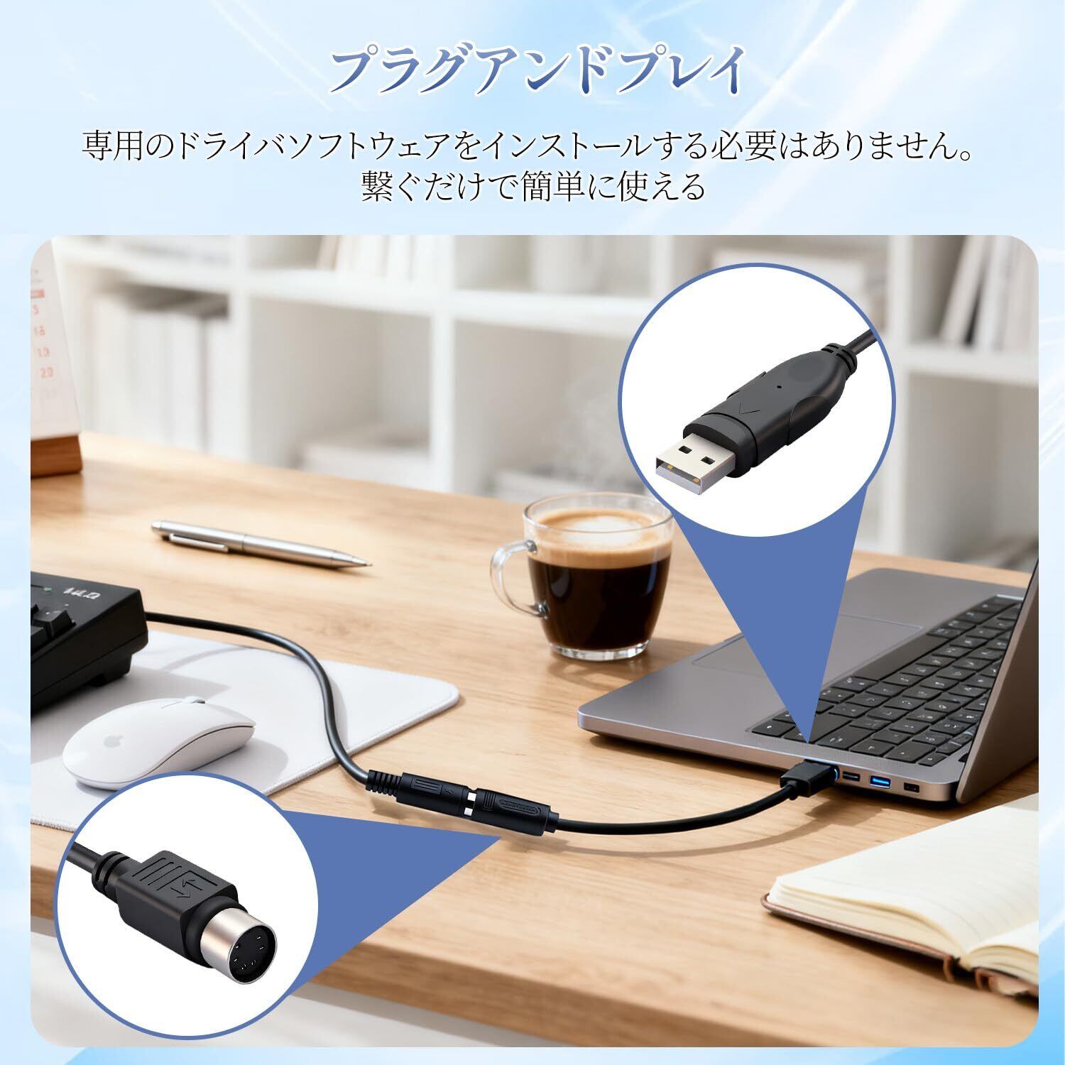 本商品は、USB A(オス)とミニDIN 6pin (メス)の設計になっており、特別な設定やドライバのインストールは不要です。接続するだけでスムーズに使用できるため、ストレスなく作業を進めることができます。
