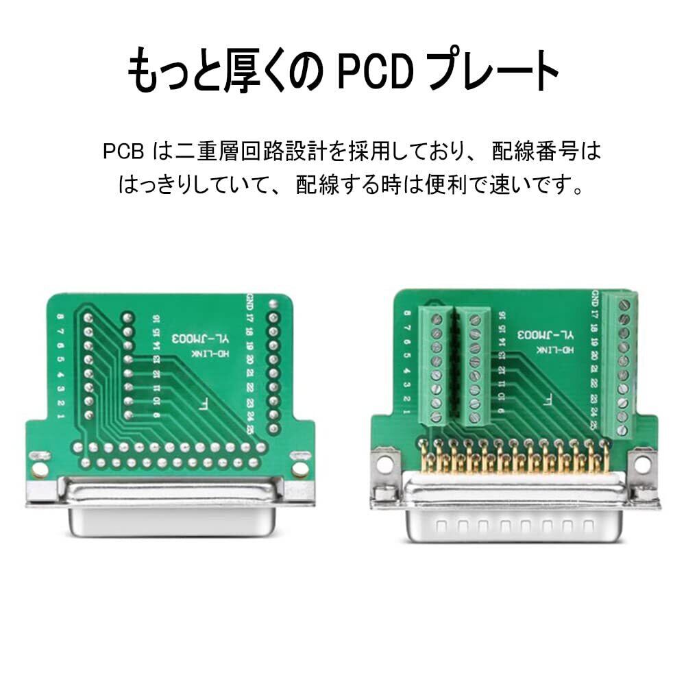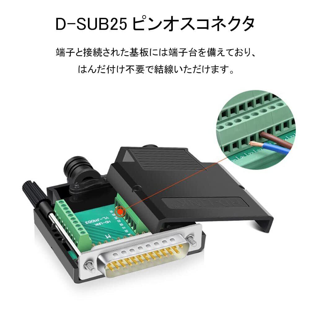 D-SUB用25ピンオスの自作コネクタです。端子と接続された基板には端子台を備えており、はんだ付け不要で結線いただけます。