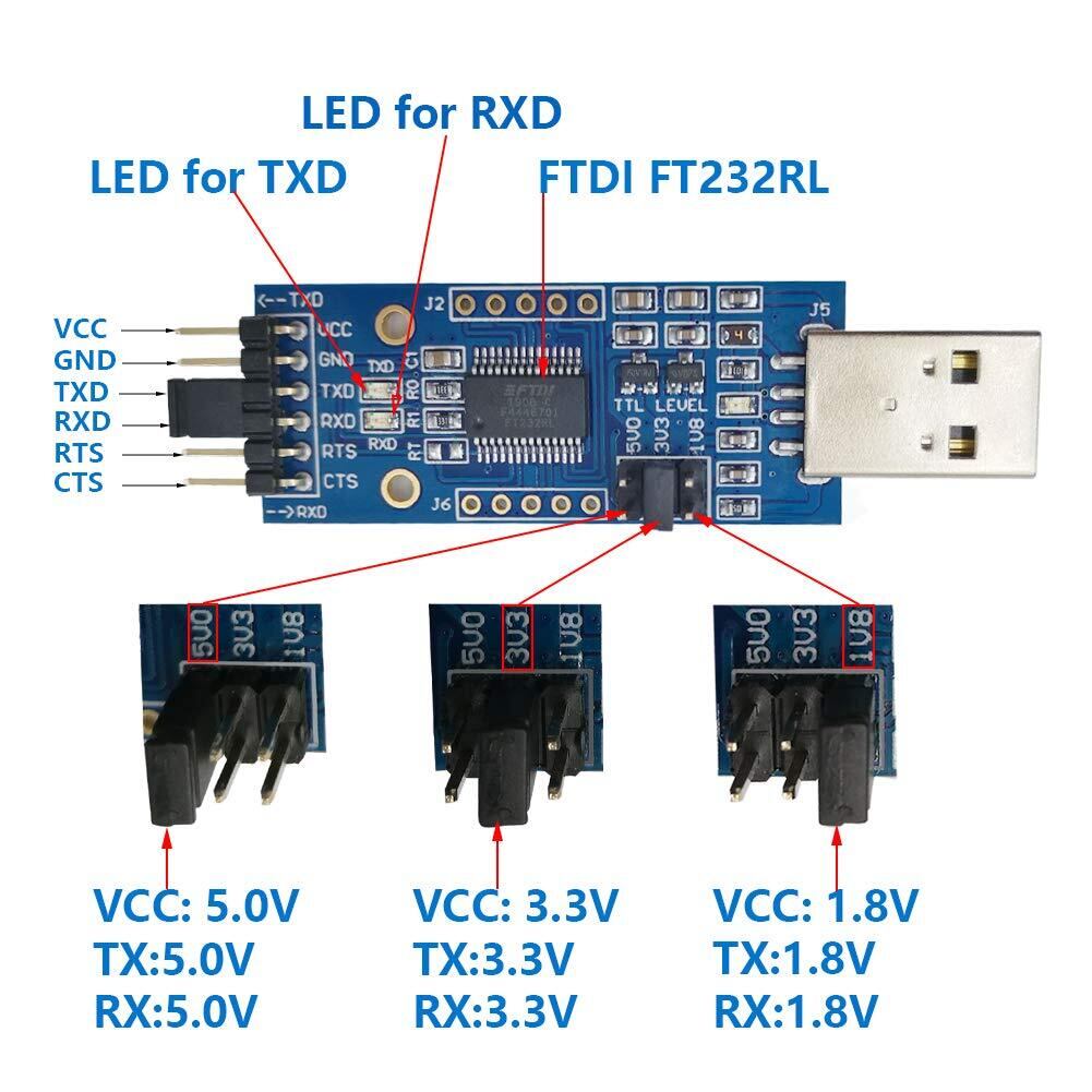 FTDI FT232RL IC:オリジナルのFTDI FT232RL ICチップを内蔵された。 5V、3.3V、1.8VのロジックTTLレベルをサポートしています。ジャンパでロジックレベルを切り替えることができます。