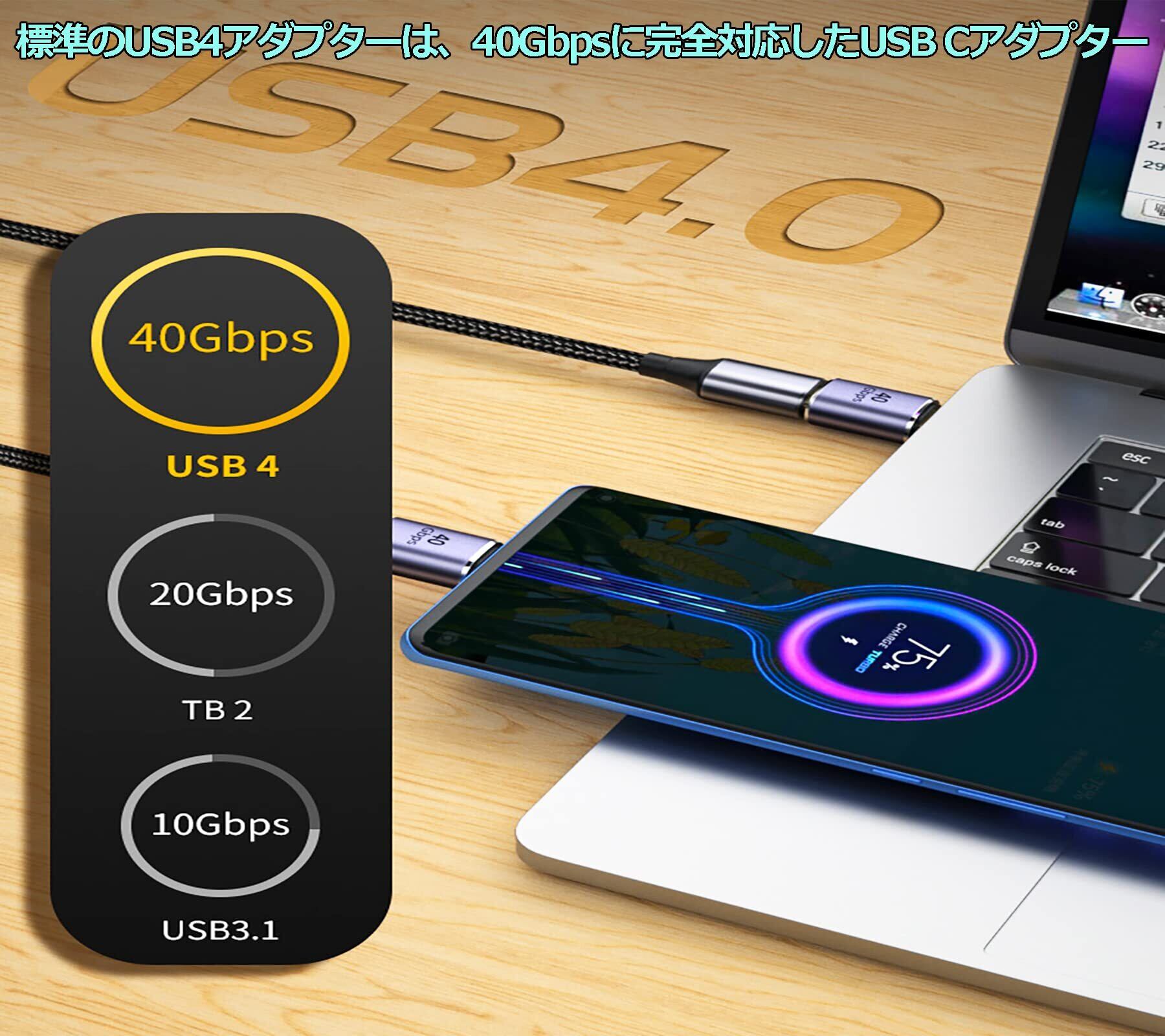 「USB4.0 USB-C 変換アダプタ」は、急速充電と高画質映像出力を両立した優れたアダプタです!最大40Gbpsの超高速データ転送と、PD100W/5Aの急速充電に対応しており、様々なデバイスで快適にご利用いただけます。