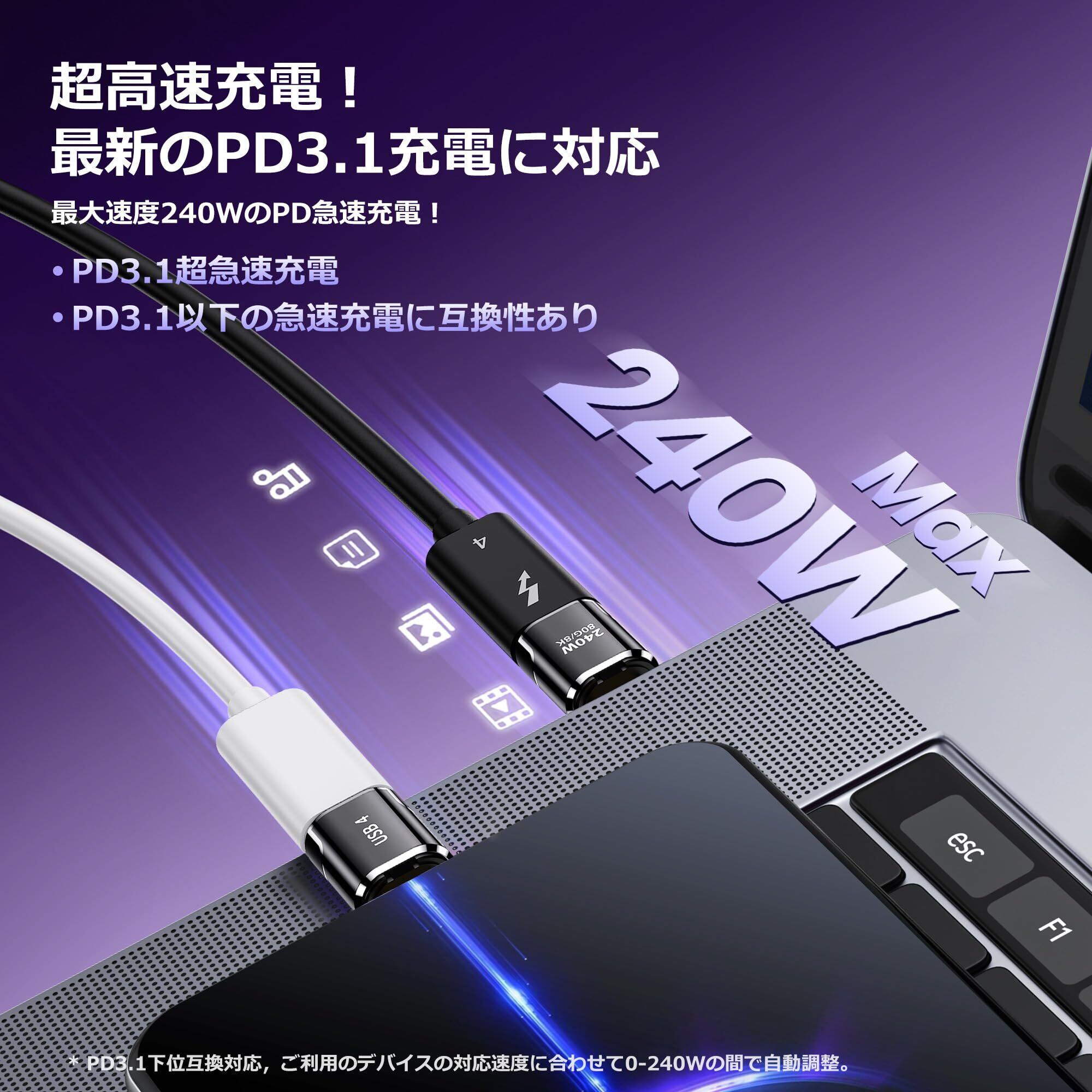 USB Power Delivery(PD)に対応し、240Wの急速充電が可能です。ノートPCやスマートフォン、タブレットなど、さまざまなデバイスを迅速に充電できるため、忙しい日常の中でも安心して使用できます。