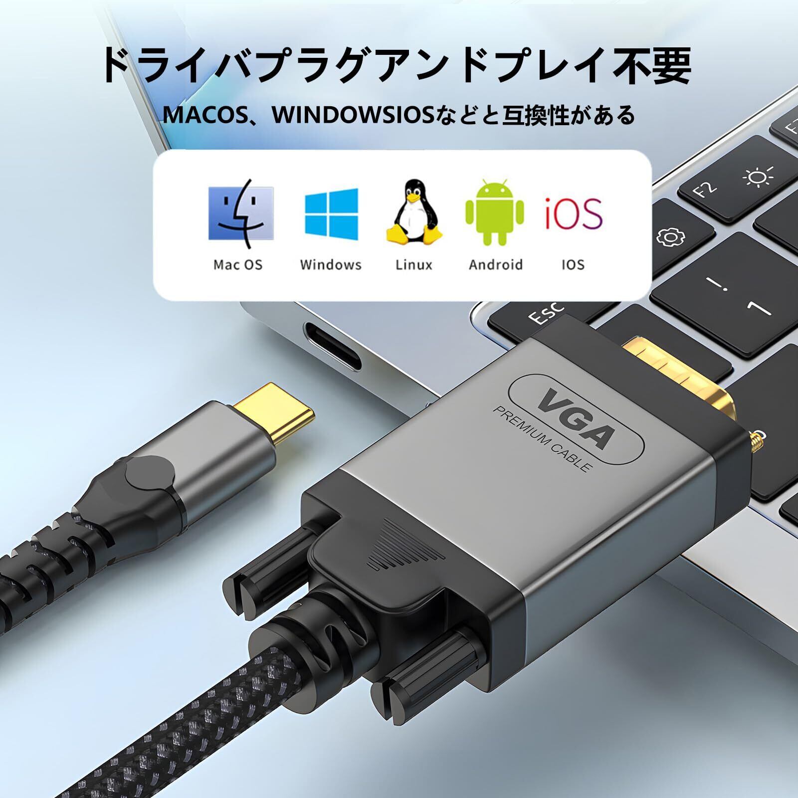 「USB-C to VGA ケーブル」は、最新のType-CデバイスをVGA対応ディスプレイに接続するための理想的なソリューションです!1080Pの高解像度をサポートし、鮮明でクリアな映像を実現します。
