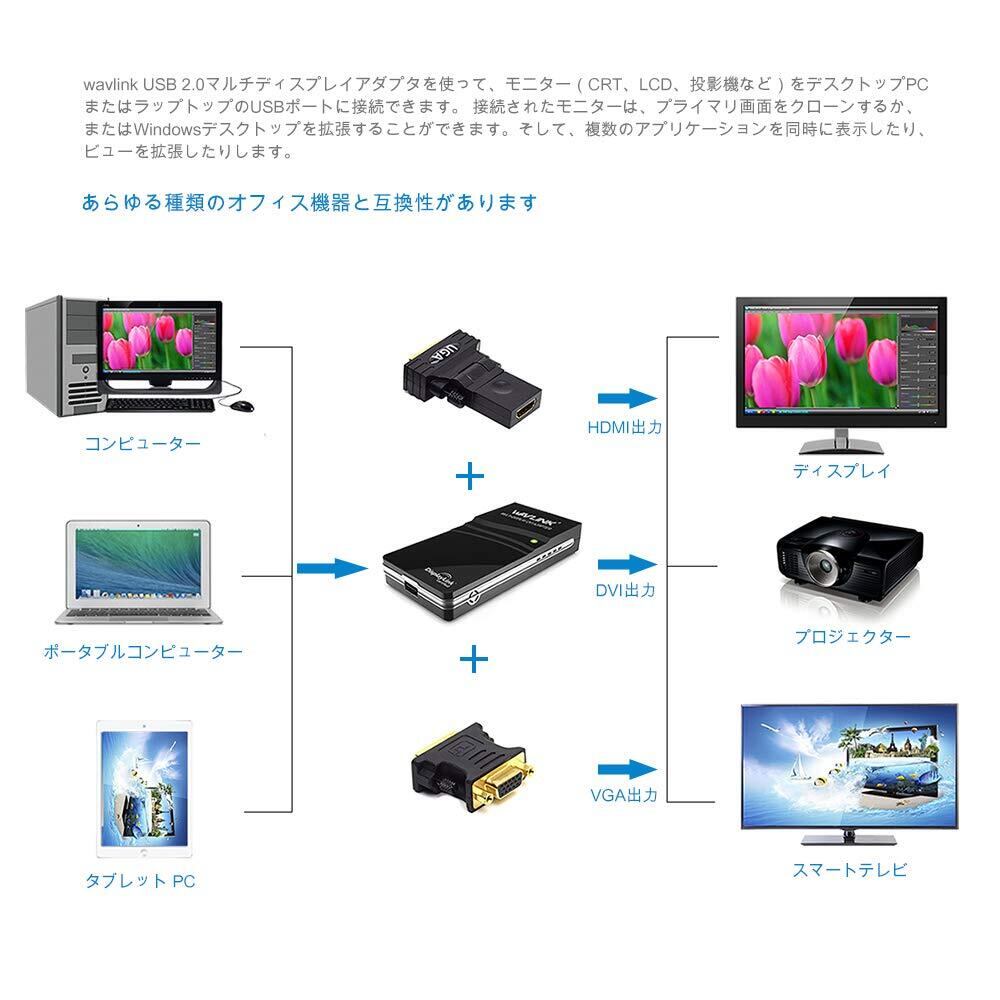 「Wavlink USB2.0のVGA/DVI/HDMIマルチディスプレイアダプタ」は、複数のディスプレイを簡単に接続できる理想的なソリューションです!最大1920×1080の高解像度をサポートし、美しい映像体験を提供します。