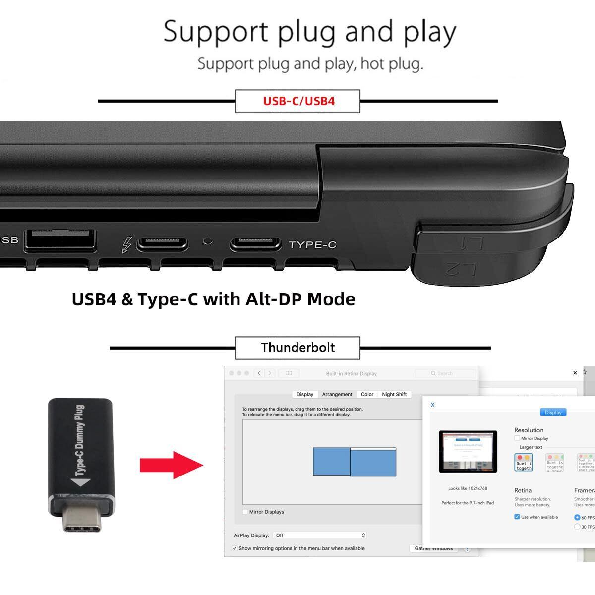 usb-c hdmi、dvi、vga、displayport、mini-dp用の仮想ディスプレイアダプターがあります。購入するには、ストアで「CY Virtual display」を検索してください。
