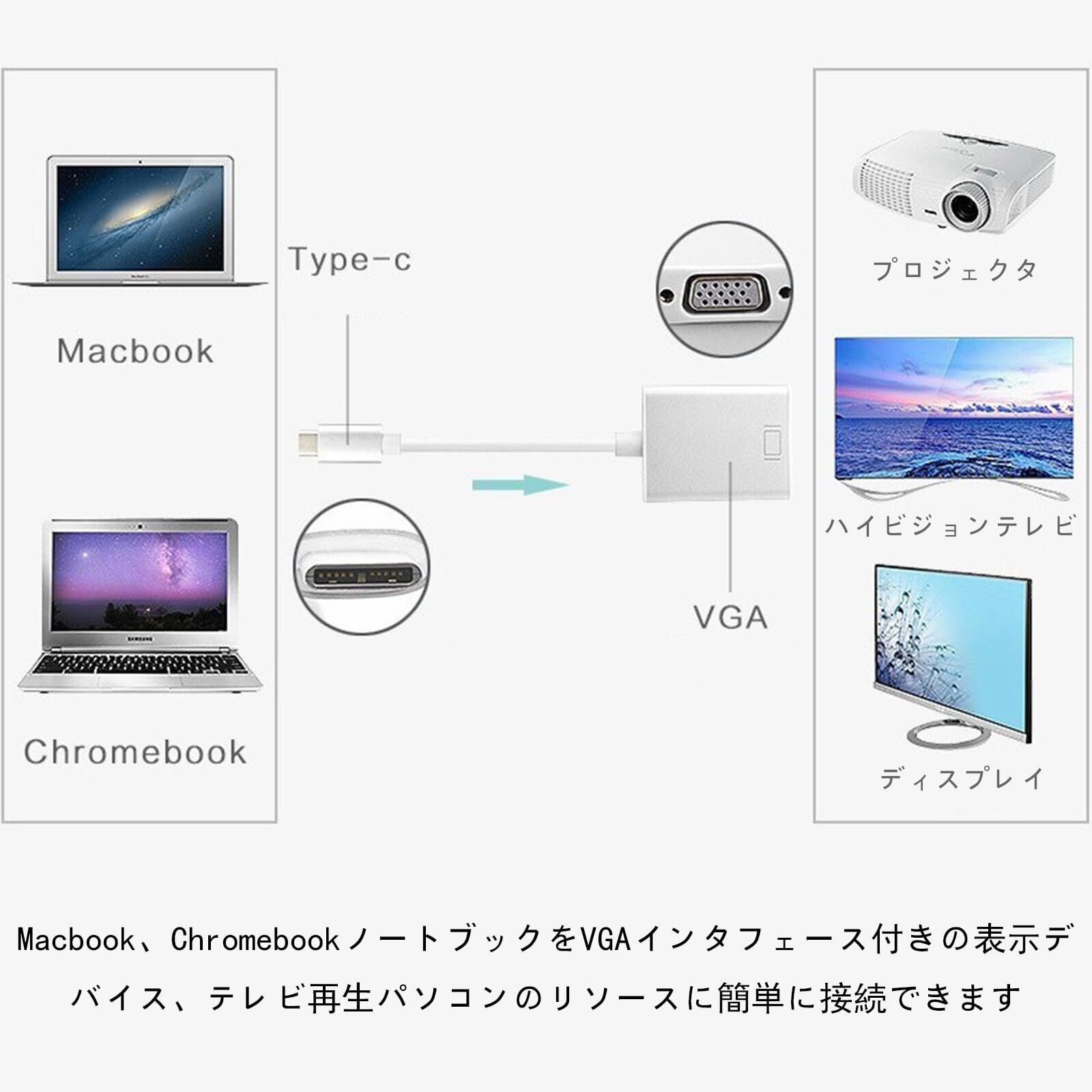 【互換性】:本製品はディスプレイ、プロジェクタ、テレビなどのVGAインタフェースデバイスに適用し、Macbook Air、ChromebookなどのType Cインタフェースデバイスにも適用する。