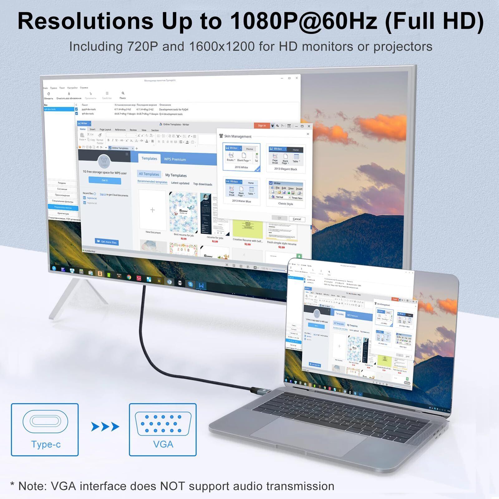 USB C VGAコードは、高解像度画像の表示、ビデオの再生、ビジネスプレゼンテーションの実施など、最大1080pの高解像度出力をサポートし、高色再現と豊かな画像ディテールで鮮明で鮮明な画像を表示できます。
