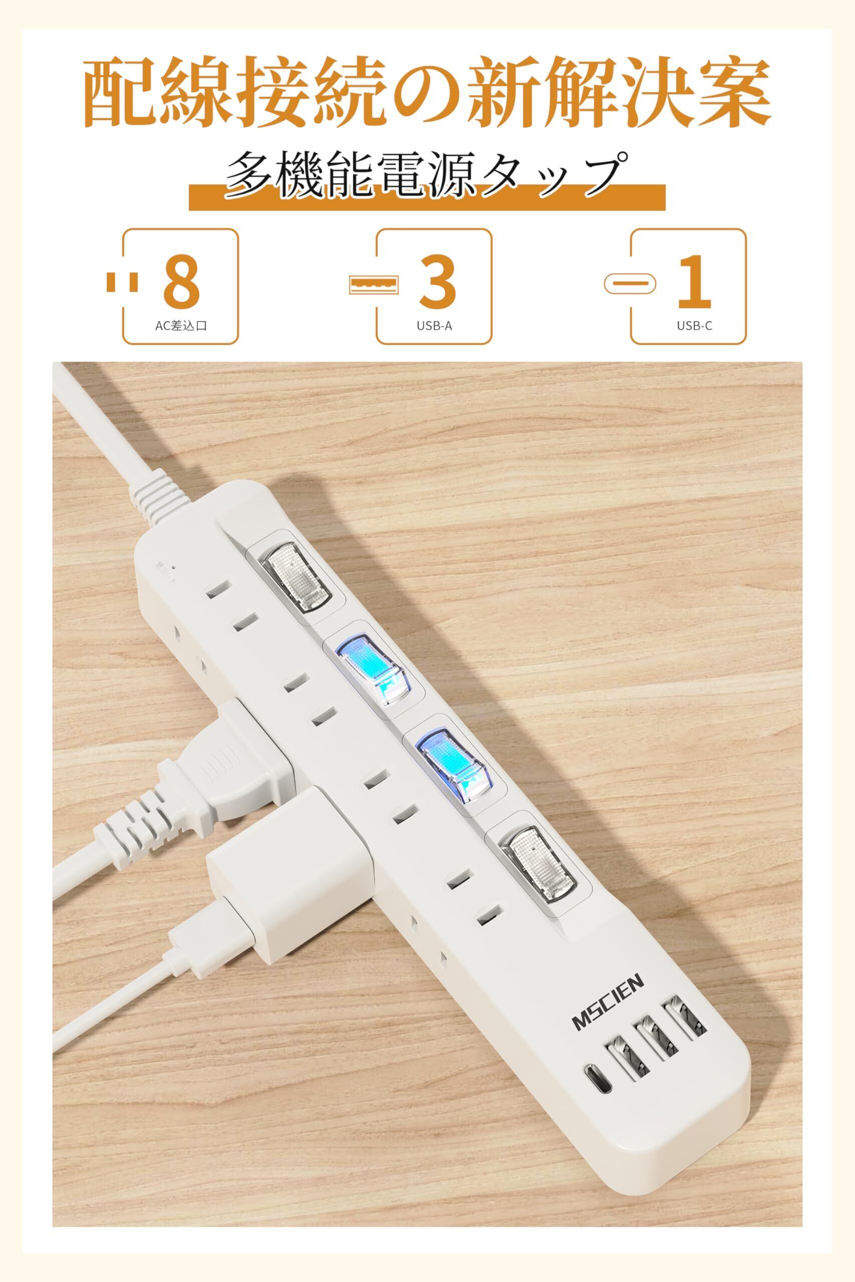 「Mscien 電源タップ USB付き 8個AC口」は、家庭やオフィスの電源管理を一新する便利な延長コードです!8個のAC口、1個のUSB-Cポート、さらに3個のUSB-Aポートを搭載しており、様々なデバイスの同時充電が可能です。