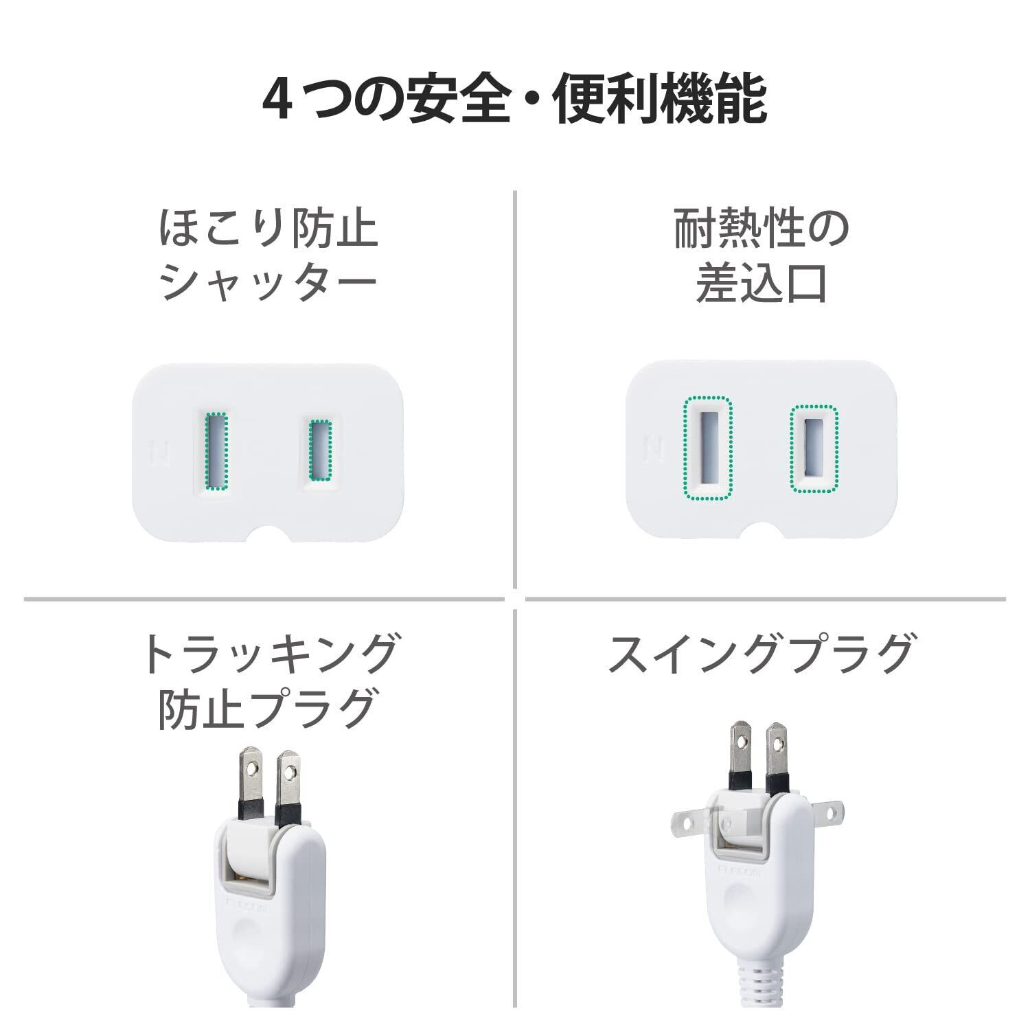 本製品にはほこり防止シャッターが装備されており、使用しないコンセント口をしっかりと塞いで、埃や異物の侵入を防ぎます。安全性を重視したデザインで、家族やペットがいるお宅でも安心して使用できます。