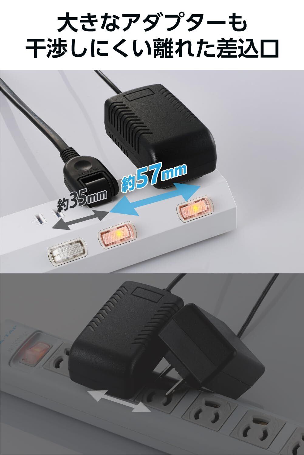 差込口の間隔は広いところが57mm、狭いところが35mmです。広い間隔で配置された差込口は、大きなアダプターを挿しても隣の差込口に干渉しにくくなっています。