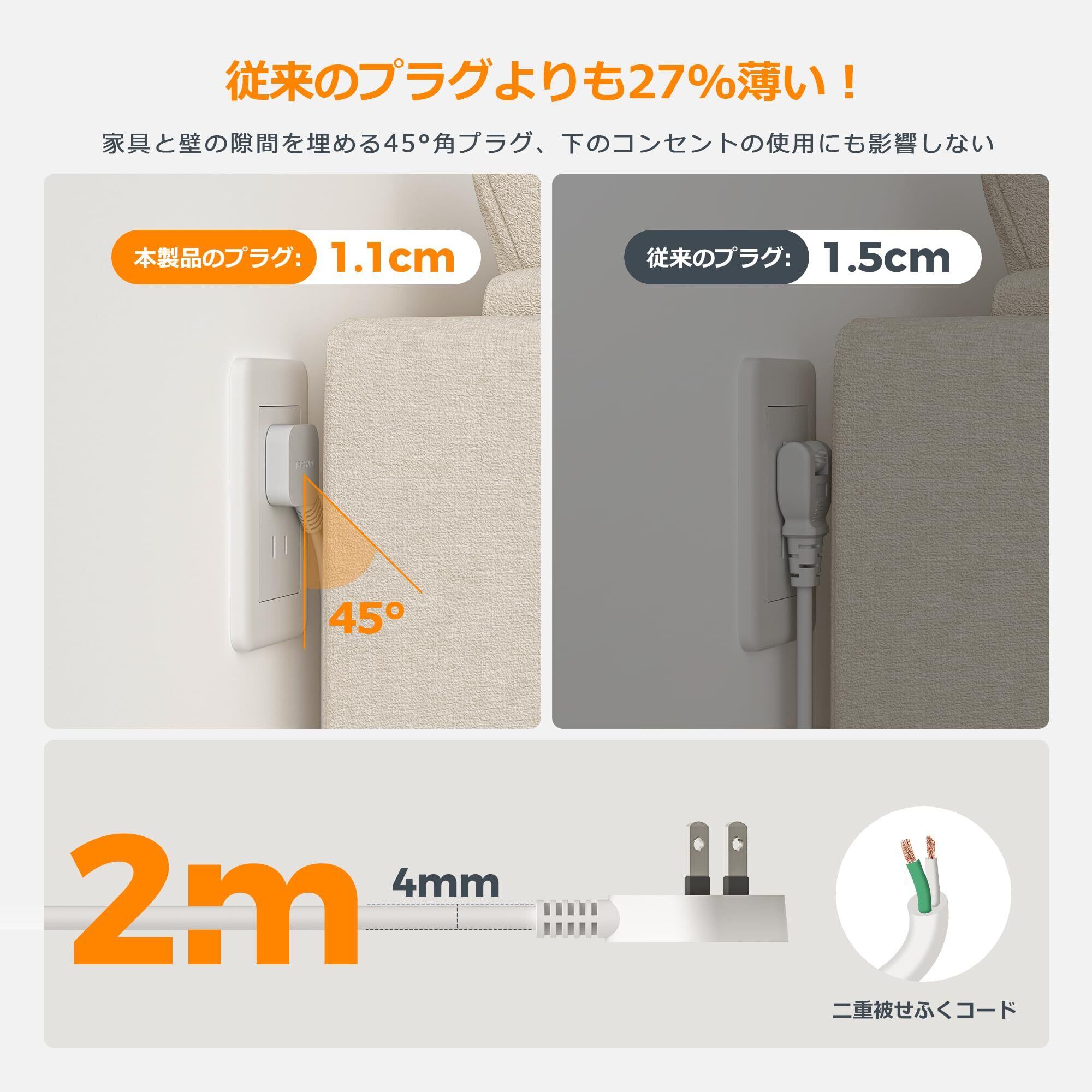 【電源タップ 薄型・コーナータップ】延長コード 2m 薄型と薄型プラグの採用により、狭い隙間でも配線がしやすくなっています。家具の後ろや壁際でも、スペースを有効に活用できるため、見た目もすっきりします。それに、45度の角度設計のL型プラグを壁のコンセントに差し込んだときに他のコンセントを妨げません。コンパクトで使いやすい設計で、家庭やオフィスでの日常使いに最適です。