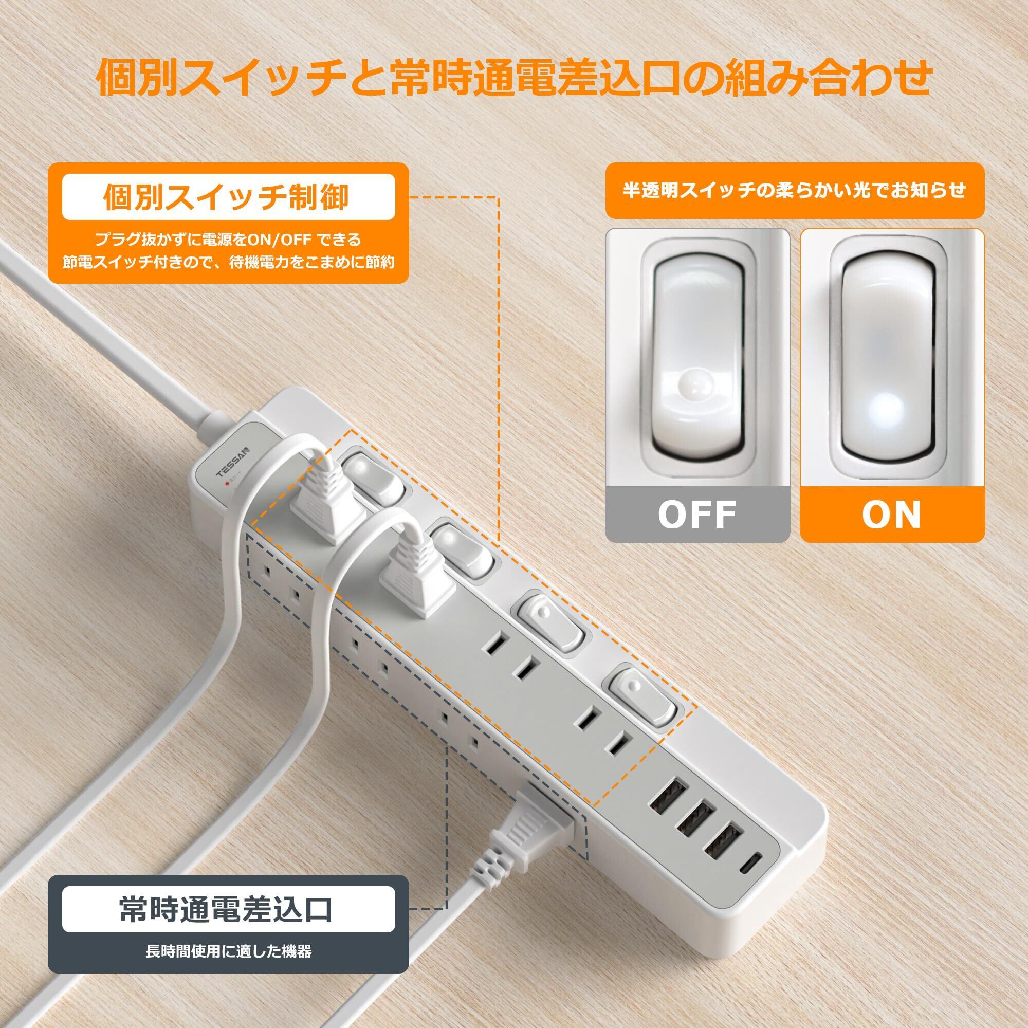 「TESSAN 電源タップ」は、8個のAC口と4つのUSBポートを備え、同時に多くのデバイスを充電・接続できる便利な電源タップです!省スペースで設置できる薄型デザインが特徴で、家庭やオフィスでの利用に最適です。