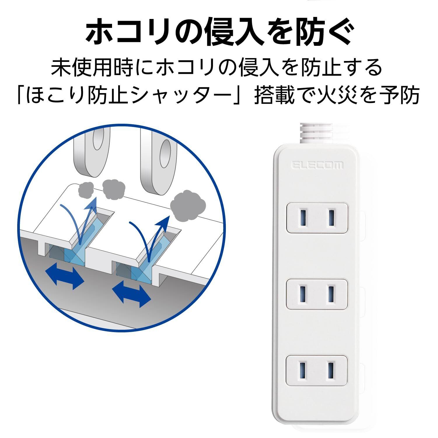 差込口には耐熱性に優れたユリア樹脂を使用し、万一の発熱にも対応できる安全設計です。また、未使用時にはほこりの侵入を防ぐ「ほこり防止シャッター」がついており、トラッキング現象による火災のリスクを軽減します。