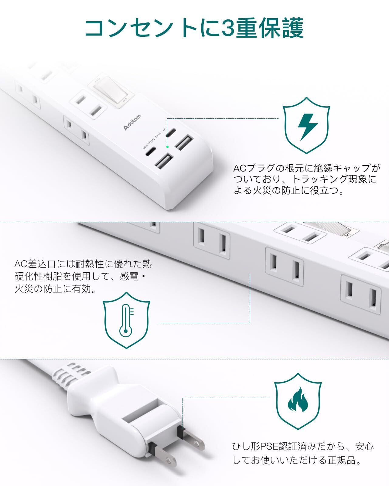 【雷サージ保護機能&コンセント4重保護】電気火災を防ぐため、ACプラグの根元に電気を通さない絶縁キャップがついており、トラッキング現象による火災の防止に役立ちます。 さらに、AC差込口には、万一の発熱の際にも融解しにくく、電気火災の防止に有効な耐熱性に優れた熱硬化性樹脂を使用しています。電源コードには、二重被ふくコードを採用していますので、断線や被ふく破れによる感電・火災の防止に有効です。雷サージ保護機能より、サージ、電圧スパイク、電圧ノイズ、静電気による干渉を排除し、電気製品の耐用年数を効果的に延長します。