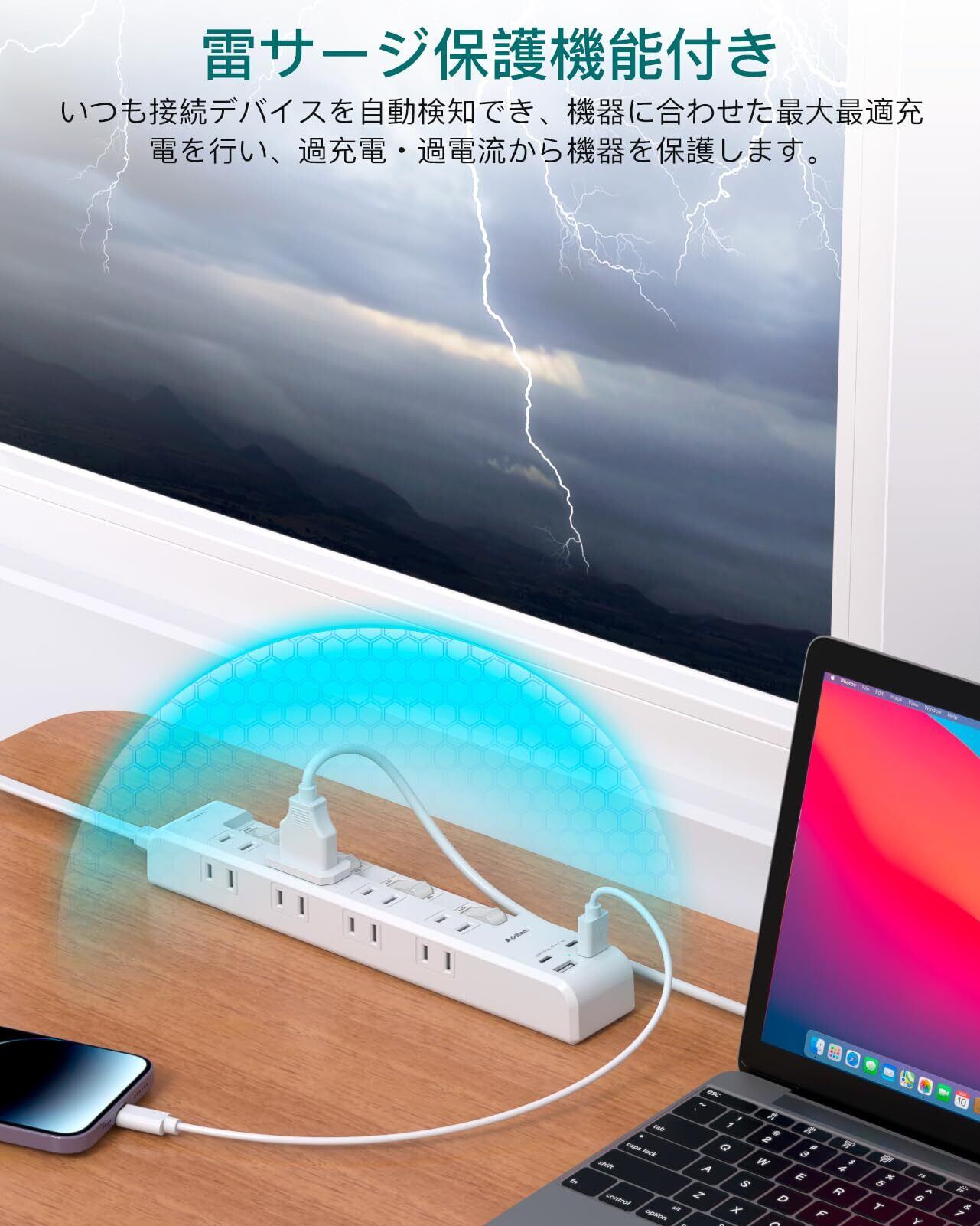 雷ガード機能を搭載しており、落雷や電圧スパイクから大切なデバイスを守ります。耐熱性に優れた材料を使用しているため、万一の発熱時にも安心です。高品質な二重被ふくコードが、感電や火災のリスクを軽減します。